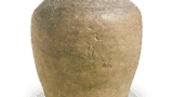 古九谷色绘松涛纹大盘 古九谷古九谷色绘松涛纹大盘 2025.10.11 古九谷色绘松涛纹大盘 高11.3厘米 口径42.3厘米 底径21.8厘米在宽阔的盘面中央,一棵松树以强劲笔触描绘而成,此纹样属于古九谷风格之一,在青手古九谷中尤为令人印象深刻。盘身采用带阶梯状腰部的宽大平底盆造型,边缘饰以红釉。盘面以黑色线描自由舒展地绘满涡形流水纹,上施黄釉;松树树干为绀青色,岩石为绿色,边缘纹样则以青海波风格为底纹,上绘绿色釉彩。背面全面绘有菊花唐草纹,以黑色线描勾勒,上薄施黄釉。高台内侧双角框内刻有“福”字铭文。