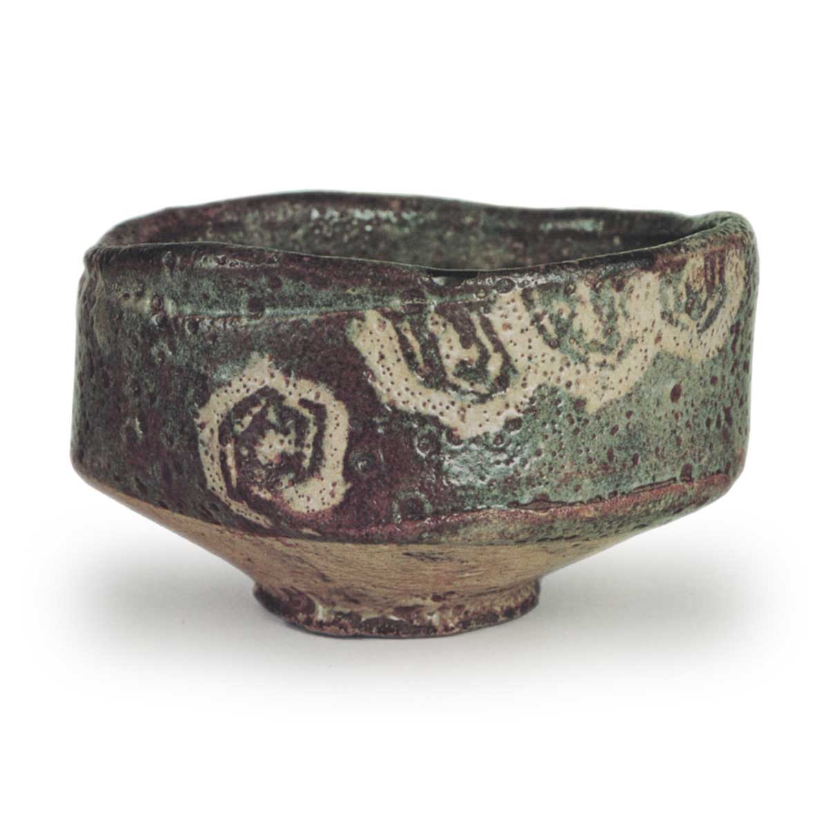 器身靠近器足与器身交界处,在两条水平雕刻线之间有一大块装饰,器足呈不规则多边形,类似足戒的形状,这在早期的乐烧茶碗中很常见,使这件作品具有强烈的手工感。
