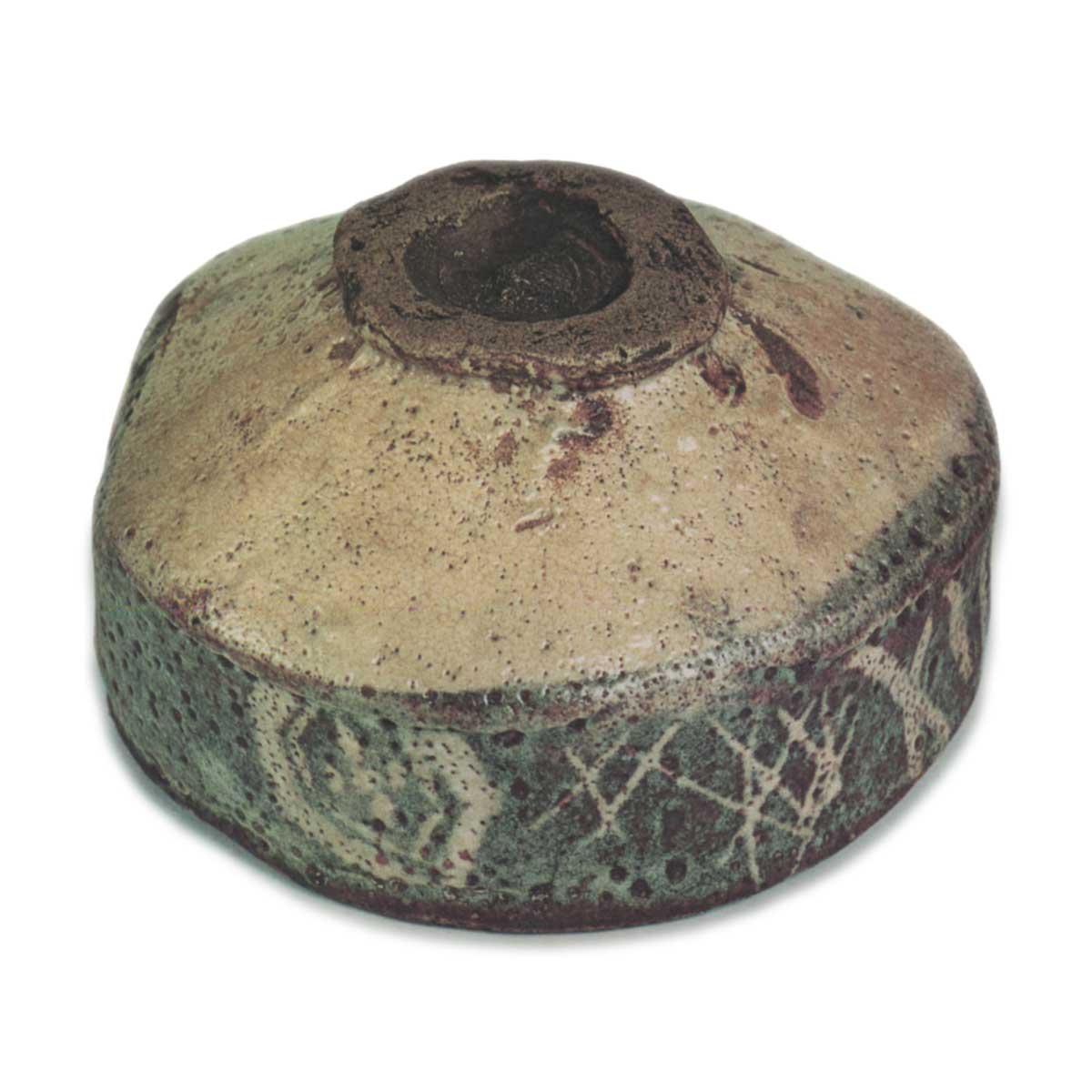 陶土的颜色略粗糙,呈落叶色,但足环的未上釉部分和足环的背面都涂有清漆,以保护它们免受时间侵蚀。在陶轮上成型后,器皿的上部从四面轻轻按压,因此边缘不是圆形的,而是略微倾斜的。 边缘内侧被切割成一定角度,使其边缘更厚,外缘下边缘增加了一排雕刻,使其具有向外张开的视觉效果,高度和深度类似于五座山等,边缘制作中使用的痕迹非常明显。
