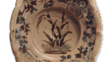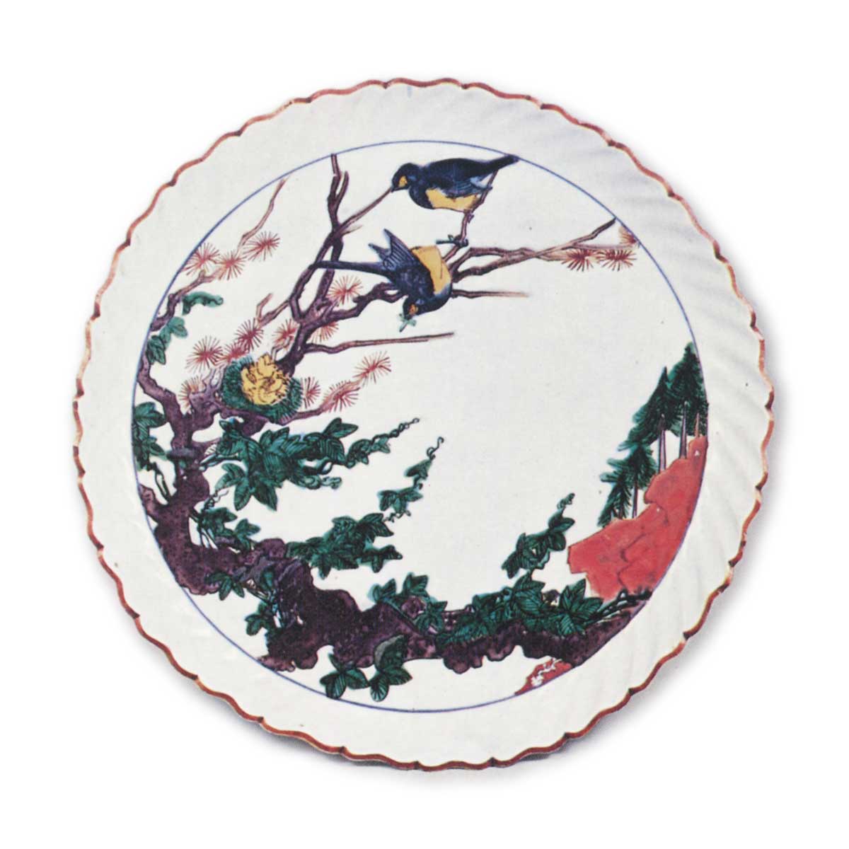 古九谷色绘树木双鸟纹轮花盘 古九谷古九谷色绘树木双鸟纹轮花盘 2025.10.11 古九谷色绘树木双鸟纹轮花盘 高2.9厘米 口径20.8厘米 底径14.2厘米此作构图亦属绝无仅有。古松枝头栖息着双鸟,树干缠绕着蔷薇藤蔓。尤为精妙之处在于树间描绘鸟巢并绘有雏鸟,如此独特的题材为何被构思出来,着实耐人寻味。器底侧面饰以松叶散文纹,高台内角处书写“福”字铭文,并施以绿色上彩。