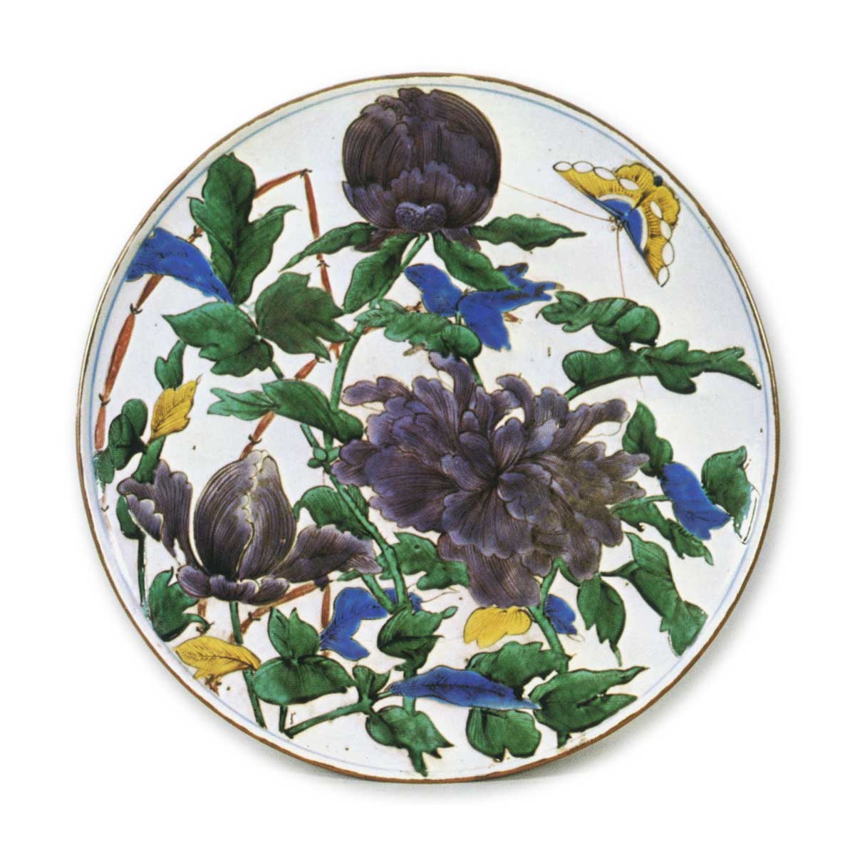 以浓郁的紫色颜料恣意描绘大朵牡丹的构图,作为象征古九谷样式的绘纹图案备受推崇。现存此类牡丹纹大盘约五件,其中三件内壁饰有几何纹样,而本品与下图所示器物则在盘面满布牡丹与蝴蝶纹饰。此为圆形平底盘,边缘几乎未立起,在古九谷样式的大盘中亦属罕见器形。
