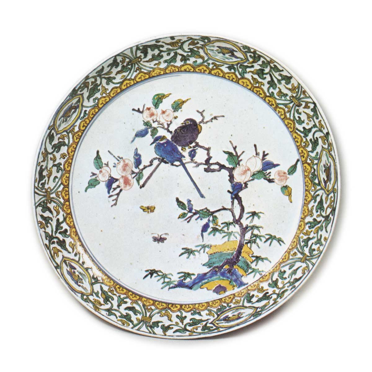 古九谷彩绘双鸟桃树纹大盘 古九谷古九谷彩绘双鸟桃树纹大盘 2025.10.11 古九谷彩绘双鸟桃树纹大盘 高7.4厘米 口径37.4厘米 底径19.3厘米此件亦被认定为重要美术品。其制作手法与前图基本相同,侧面纹样布局及底面纹饰均如出一辙。内壁五方配置菱花形镂空窗,内饰鱼纹。中央以狩野派风格绘制双鸟栖桃树、岩石与竹叶的图样,此类古九谷瓷器中堪称构图典雅之作。高台内以黑墨书写变形角福铭,其上覆以绀青釉色。