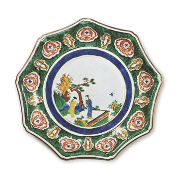 古九谷色绘松竹鸟纹九角大盘 古九谷古九谷色绘松竹鸟纹九角大盘 X Facebook Hatena Bookmark LINE Pinterest 复制 2025.10.13 古九谷色绘松竹鸟纹九角大盘 口径34.0厘米石川县立美术馆盘面中央圆窗内描绘岩石、松树与竹林,其间栖息着两只飞鸟,构图虽略显程式化却整齐有序。绿色木瓜形窗格内以赤色绘制凤凰纹样,盘底饰以青花牡丹唐草纹,高台内侧均刻有“角福”共同铭文。
