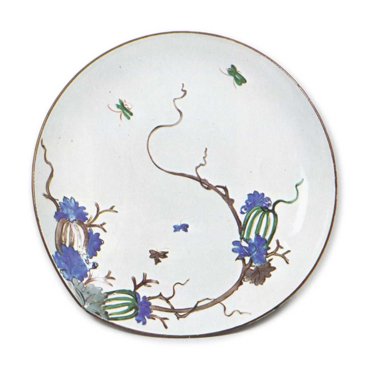 古九谷色绘瓜蝶纹大盘 古九谷古九谷色绘瓜蝶纹大盘 2025.10.13 古九谷色绘瓜蝶纹大盘 高6.3厘米 口径35.0厘米 底径20.0厘米此盘与九角手同为素地圆形红边器皿。口部因粘接处变形产生一处歪斜,为掩饰此缺陷,特以该处为起点绘制瓜纹,并点缀四只蝴蝶。底面饰有与九角手相似的唐草纹,高台内侧的青花角福铭亦如出一辙。
