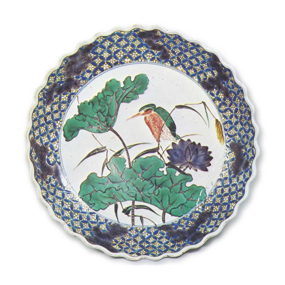 古九谷色绘翡翠纹轮花大盘 古九谷古九谷色绘翡翠纹轮花大盘 2025.10.13 古九谷色绘翡翠纹轮花大盘 高6.9厘米 口径32.5-33.3厘米 底径20.0厘米此为口沿饰轮花纹的大盘,盘面中央圆窗内绘有鲜明的莲叶与翡翠图案。莲叶以紫色叶脉为界,上釉呈现绿白双色,此类表现手法实属罕见。盘缘饰以七宝釉地松叶纹,此类设计亦属绝无仅有。底面采用青花与绀青彩绘制三处折枝梅纹,余白处绘有藤蔓状蔓草纹样。
