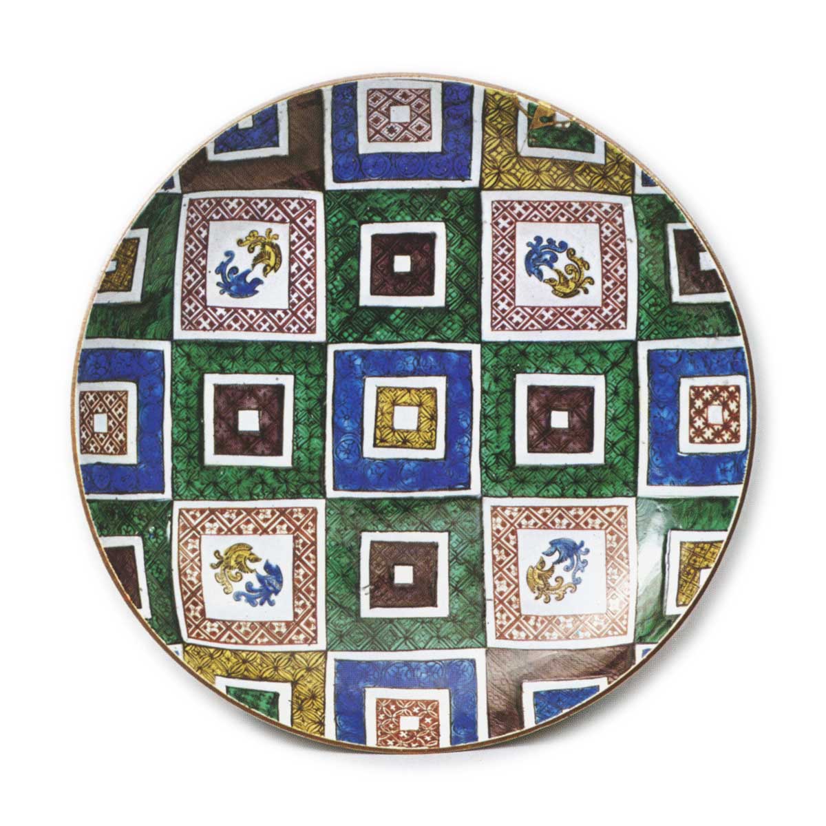古九谷色绘石板纹双凤纹大盘 古九谷古九谷色绘石板纹双凤纹大盘 2025.10.13 古九谷色绘石板纹双凤纹大盘 高7.0厘米 口径34.5厘米 高台径20.2厘米石川县立美术馆盘面采用石板纹样排列的方形纹饰,作为古九谷风格的独特设计广为人知。前田家亦传承有同类器物,皆应为有田烧制品。紫、绀青、绿、黄及赤色构成的配色鲜明夺目,在四方斜纹底纹的方格内,对称配置着相互凝视的凤凰纹样。此盘为浅口盘,盘缘饰红,底面以青花绘制八方牡丹唐草纹,高台内双圈内以青花题写角福铭,其上覆以绿釉。此石板纹盘乃明治十三年(1880年)由石川县厅购入,其高台所贴标签上载有“购入十三年古九谷代价二十圆”之记载。