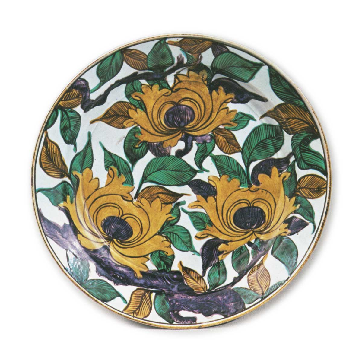 古九谷色绘牡丹纹大盘 古九谷古九谷色绘牡丹纹大盘 2025.10.13 古九谷色绘牡丹纹大盘 高6.9厘米 口径31.5厘米 底径15.5厘米石川县立美术馆此为腰部带阶的大盘,盘面满布三面兜花状牡丹花,间以叶片点缀。黄、紫、绿三色配色鲜明,极具视觉冲击力。虽属五彩手工艺品,其设计意境却与青手古九谷相通。盘底奔放地饰有唐草纹,高台内侧书有大型角福铭文。本品为重要美术品。