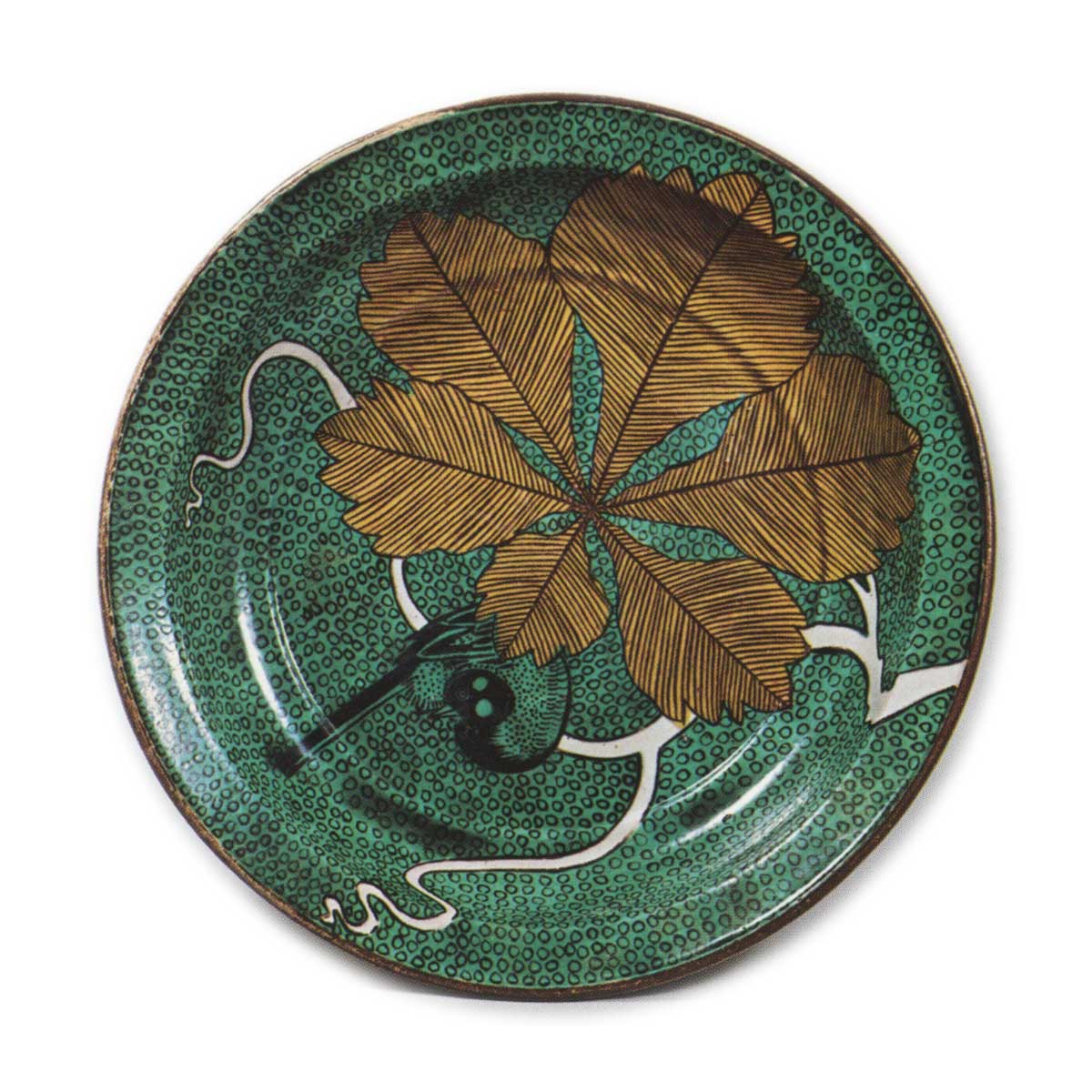 古九谷色绘柏叶鸟纹大盘 古九谷古九谷色绘柏叶鸟纹大盘 2025.10.14 古九谷色绘柏叶鸟纹大盘 高7.6厘米 口径33.0厘米 底径16.3厘米此盘腰部设阶,盘面以黄彩绘制一幅大柏叶纹样,枝干留白,叶影间以黑彩绘制鹊鹎一羽与地纹,并施以鲜艳的绿釉。以柏叶为主体,将鸟类作为纹样中的副题呈现,此构思颇具巧思。外圈未采用普通青釉的满涂技法,而是以两道涡纹带状环绕,施以黄釉。高台内刻有双重角形福字铭文。