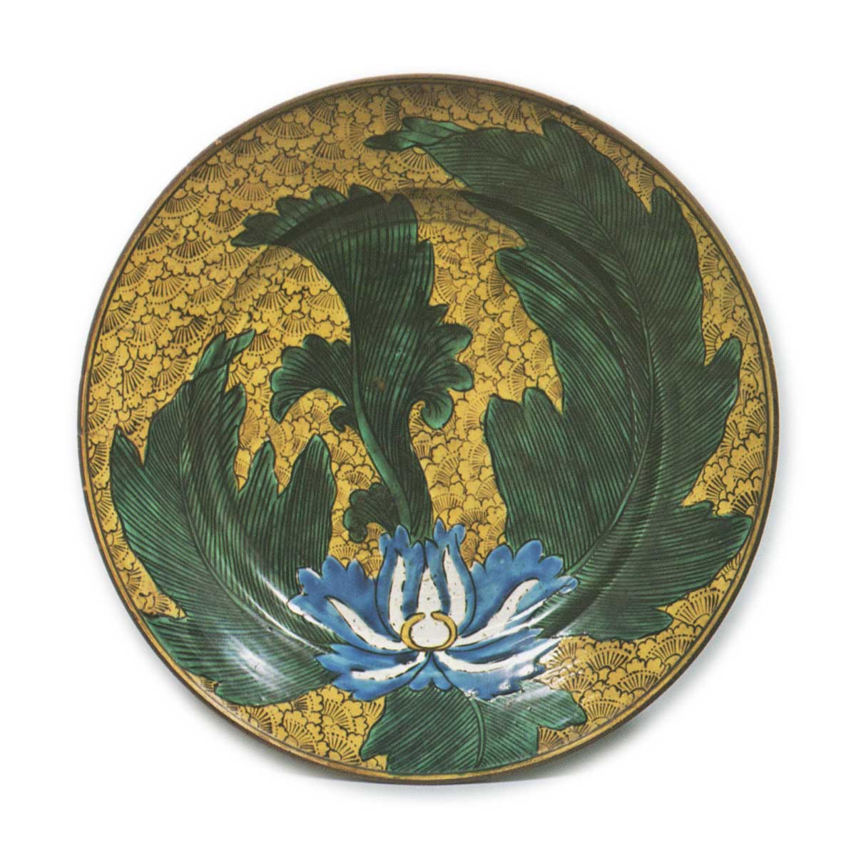 古九谷色绘牡丹纹大盘 古九谷古九谷色绘牡丹纹大盘 2025.10.15 古九谷色绘牡丹纹大盘 高6.5厘米 口径31.6厘米 底径16.7厘米以白色为底,花蕊用黄色、花瓣用深蓝色描绘的牡丹花略显小巧,而叶片却异常夸张地展开的构图令人出乎意料,但青手瓷器中常采用此类突破常规的设计。以青海波纹样表现花瓣的底纹,乃青手瓷器常用纹饰。器底饰菊唐草纹,高台内刻角福铭,整体施以绿釉。