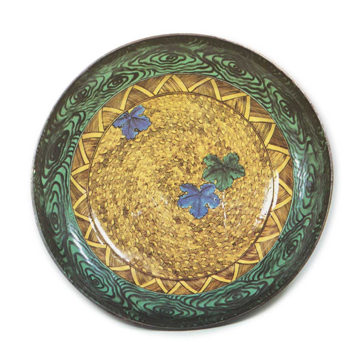 古九谷色绘蔦叶纹大盘 古九谷古九谷色绘蔦叶纹大盘 2025.10.15 古九谷色绘蔦叶纹大盘 高9.9厘米 口径42.8厘米 底径20.2厘米三片藤叶简洁铺陈的构图,看似略显单薄却透出洒脱韵味。而盘缘环绕着清晰锯齿纹,外圈更饰以粗犷木纹纹样,形成严谨的纹饰布局,颇具趣味。底面饰菊唐草纹,高台内刻角福铭,施以青釉。