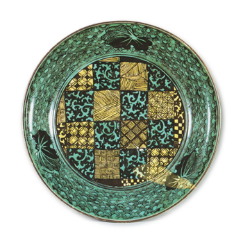 古九谷色绘鹰纹大盘 古九谷古九谷色绘鹰纹大盘 X Facebook Hatena Bookmark LINE Pinterest 复制 2025.10.15 古九谷色绘鹰纹大盘 高8.7厘米 口径37.5~38.4厘米 底径16.9厘米盘面满布牡丹双花与中央雄鹰图案,以强劲线条勾勒,底纹饰以梅花小纹。紫、绿、黄三色釉彩,紫釉面略显粗糙。底面饰波状涡纹,施淡绿釉。此类构图在青手古九谷瓷器中尤为罕见。