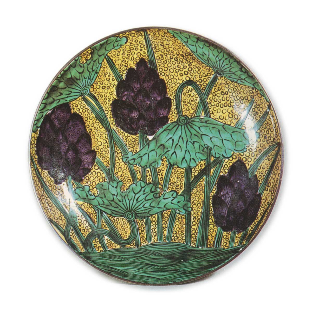 古九谷色绘莲池纹大盘 古九谷古九谷色绘莲池纹大盘 2025.10.15 古九谷色绘莲池纹大盘 高6.3厘米 口径34.5厘米 底径14.6厘米盘面描绘三朵莲花与四片莲叶,每朵莲花皆呈含苞待放之态,叶片造型各具韵味,在青手古九谷瓷器中堪称雅趣盎然的构图。