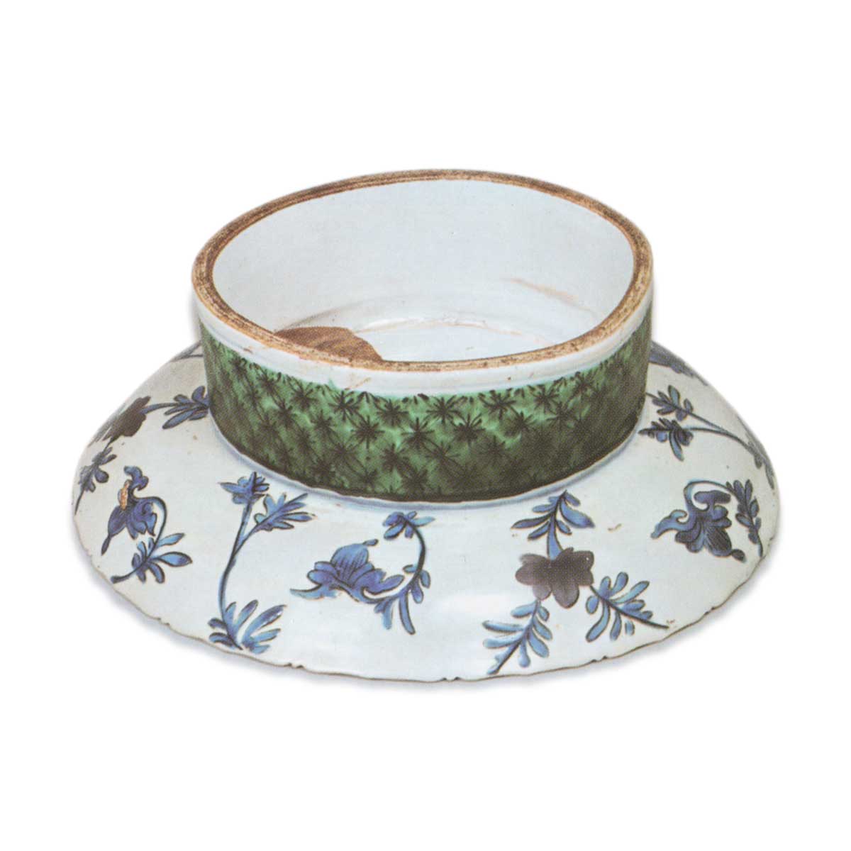 古九谷色绘菊山归来纹台盆 古九谷古九谷色绘菊山归来纹台盆 2025.10.15 古九谷色绘菊山归来纹台盆 古九谷色绘菊山归来纹台盆 高10.2厘米 口径29.3厘米 底径18.2厘米口部呈十六瓣轮花形,略浅的器身配以高大台座。器身内壁以红、黄、绀青、绿、紫五彩精妙配色,优雅描绘菊与山归来纹样。器身外缘采用十六等分环状纹饰,紫、靛蓝、黄、绿四色交替排列,因色调浓郁深沉,更衬得内壁纹样熠熠生辉。器底饰以古九谷特有的花唐草纹样,采用紫色与靛蓝上彩绘制,高台处施以绿釉。高台内侧留有未施釉的素白区域,露出素坯本色。