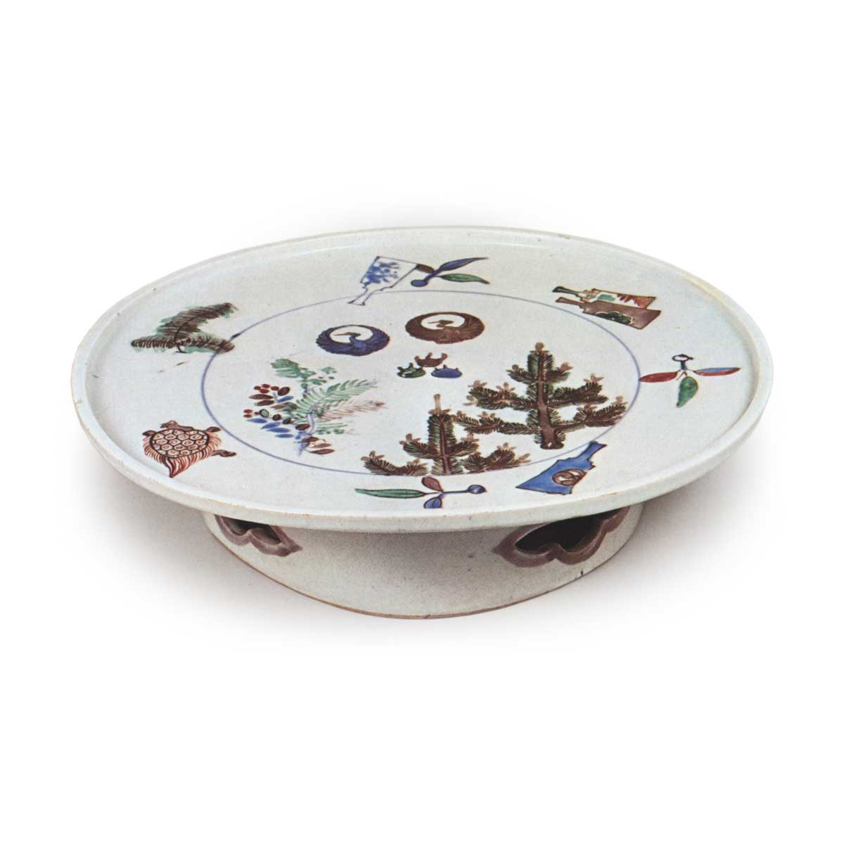 古九谷色绘吉祥纹台盆 古九谷古九谷色绘吉祥纹台盆 2025.10.15 古九谷色绘吉祥纹台盆 高6.2厘米 口径24.6厘米 底径15.9厘米 底高3.8厘米平底盆边缘清晰地低矮隆起,宽阔高耸的台座三面饰有格栅状透纹。虽制作手法略有差异,但九谷古窑址曾出土过器形相似的台盆。素坯色泽洁白,釉面中央以青花细线勾勒圆窗,内饰两株门松、三颗宝珠、白底绿叶、鹤丸纹样,外围环绕羽子板与羽毛、乌龟、松树等纹饰。此乃象征新年的经典图样,与古九谷彩绘惯用的厚重配色不同,此作采用清雅淡雅的色调施以上彩。透雕边缘点缀淡紫色。高台内侧中央可见粘接痕迹。