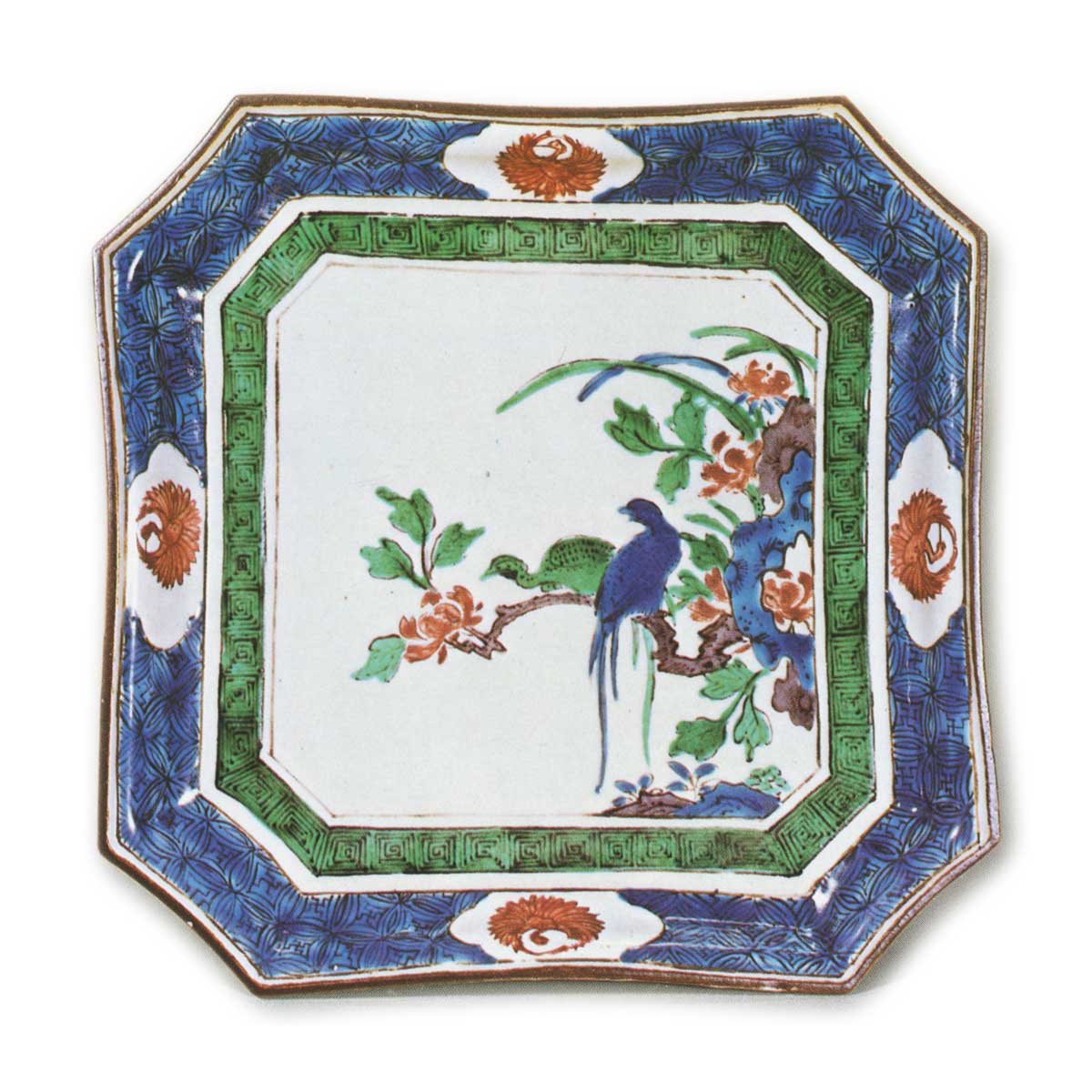 古九谷色绘牡丹双鸟纹四方隅切盘 古九谷古九谷色绘牡丹双鸟纹四方隅切盘 2025.10.15 古九谷色绘牡丹双鸟纹四方隅切盘 高3.3厘米 口径19.0×19.1厘米 底径13.5×13.5厘米此为棱角分明、胎体纤薄的四方隅切形中盘,在同类器物中尤以制作工艺精湛著称。瓷胎质地上乘,盘面绘有牡丹枝间栖息两只长尾鸟的优雅图样,然其描绘略显拘谨,稍欠舒展之韵。