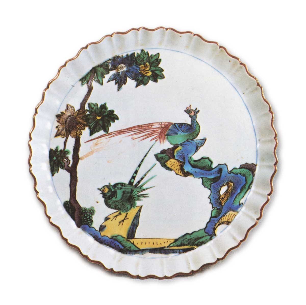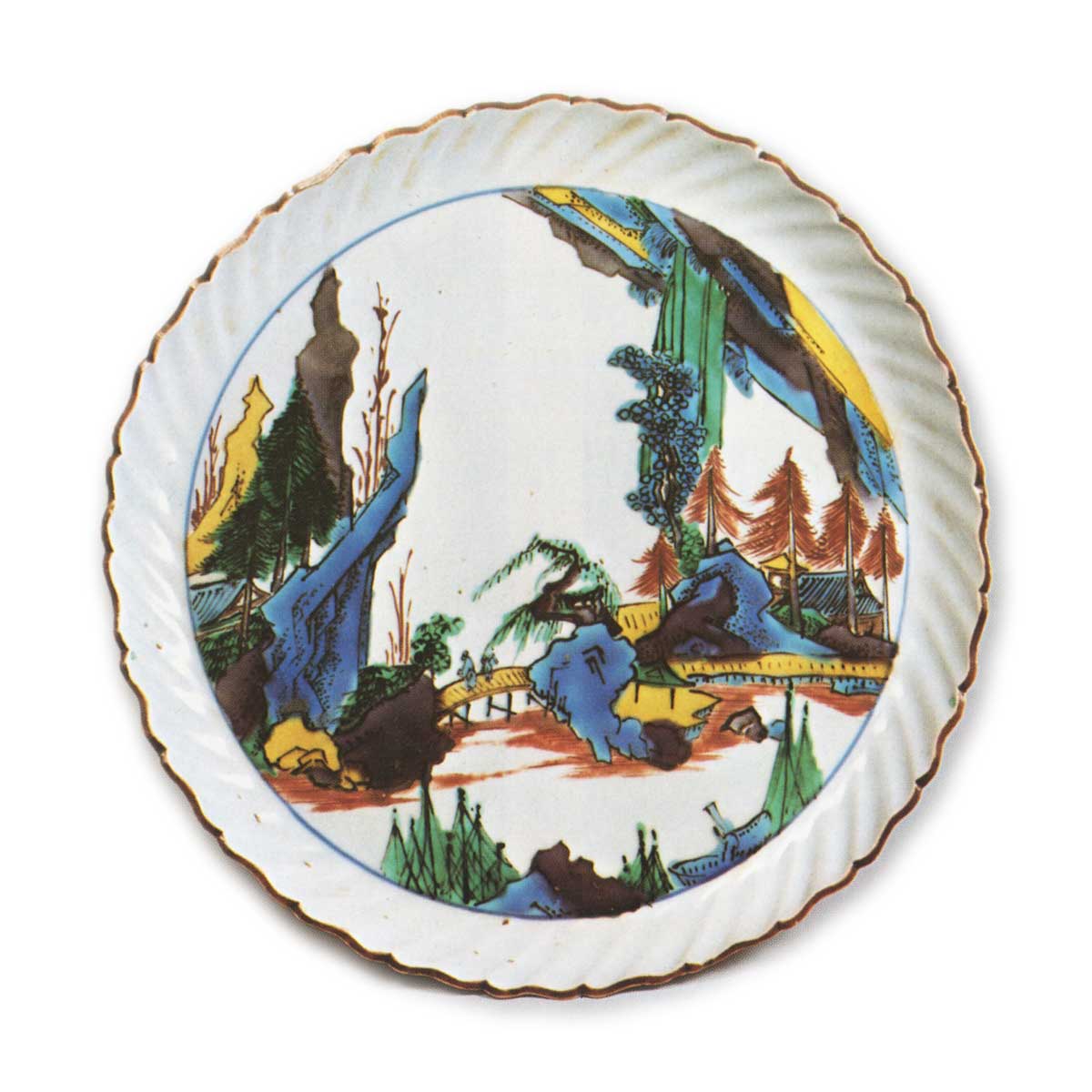 古九谷色绘轮花盘 古九谷古九谷彩绘山水桥上人物纹轮花盘 X Facebook Hatena Bookmark LINE Pinterest 复制 2025.10.15 彩绘山水桥上人物纹轮花盘 彩绘雉鸡纹轮花盘 彩绘牡丹纹轮花盘 这三枚盘子与天女纹轮花盘、鸳鸯纹轮花盘、树木双鸟纹轮花盘共同保存为六枚一套,堪称此类轮花中盘中的翘楚。六枚盘器并非原初成套传承,应是古董收藏家刻意集结的精品。作为古九谷彩绘风格的代表作,其白瓷胎质属上乘,制作工艺臻于完美。盘面图案虽经高度风格化处理略显繁复,但釉上彩绘色泽鲜艳夺目,配色更显华美动人。山水桥上人物纹轮花盘、雉子纹轮花盘背面两侧饰有唐草风格牡丹纹,牡丹纹轮花盘则饰有松叶纹,均以赤绿双色绘制。高台内刻有角福铭,并以彩绘压印固定。