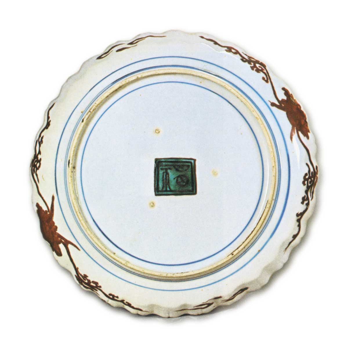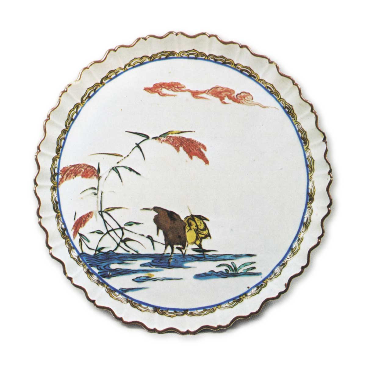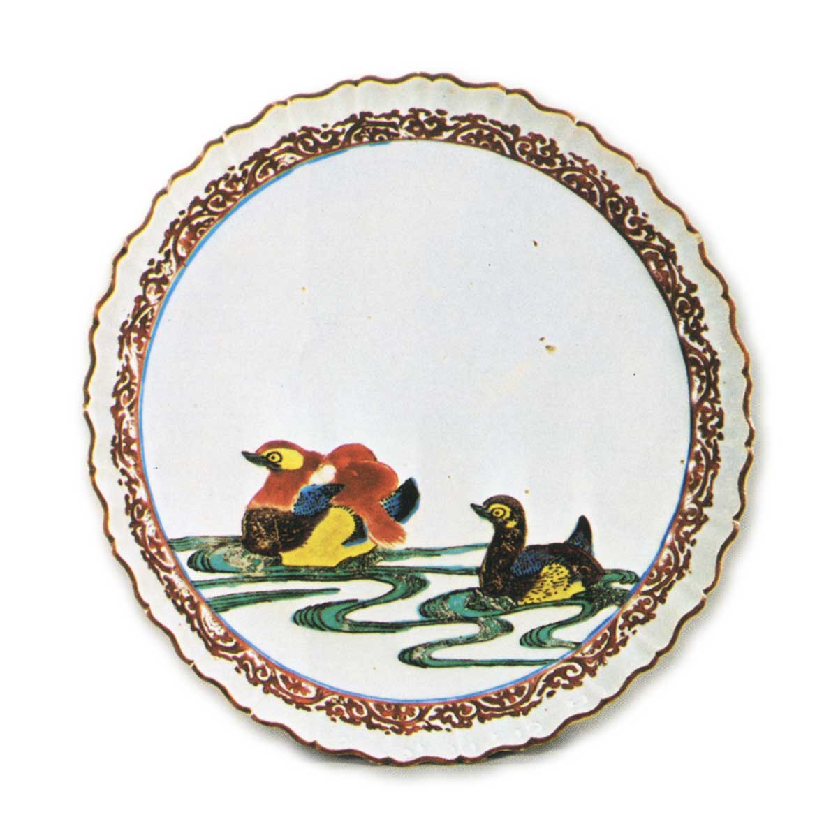 古九谷彩绘轮花盘 古九谷古九谷彩绘鸳鸯纹轮花盘 2025.10.15 彩绘鸳鸯纹轮花盘 彩绘鸳鸯纹轮花盘 彩绘牡丹纹轮花盘 彩绘鹭纹轮花盘 此类器物与雉纹轮花盘同属轮花中盘的精品,但鸳鸯纹轮花盘采用直线式轮廓花纹,鹭纹轮花盘则以扭花技法塑造。此外,鸳鸯纹轮花盘的边缘花瓣浮雕呈直线状,鹭纹轮花盘则采用扭花风格。鹭纹轮花盘采用直线式花瓣浮雕,牡丹纹轮花盘则以扭花技法制作。鸳鸯纹轮花盘与鹭纹轮花盘的纹饰描绘细腻精巧,纹样环绕盘缘;牡丹纹轮花盘与鹭纹轮花盘的背面则散落着松叶纹。