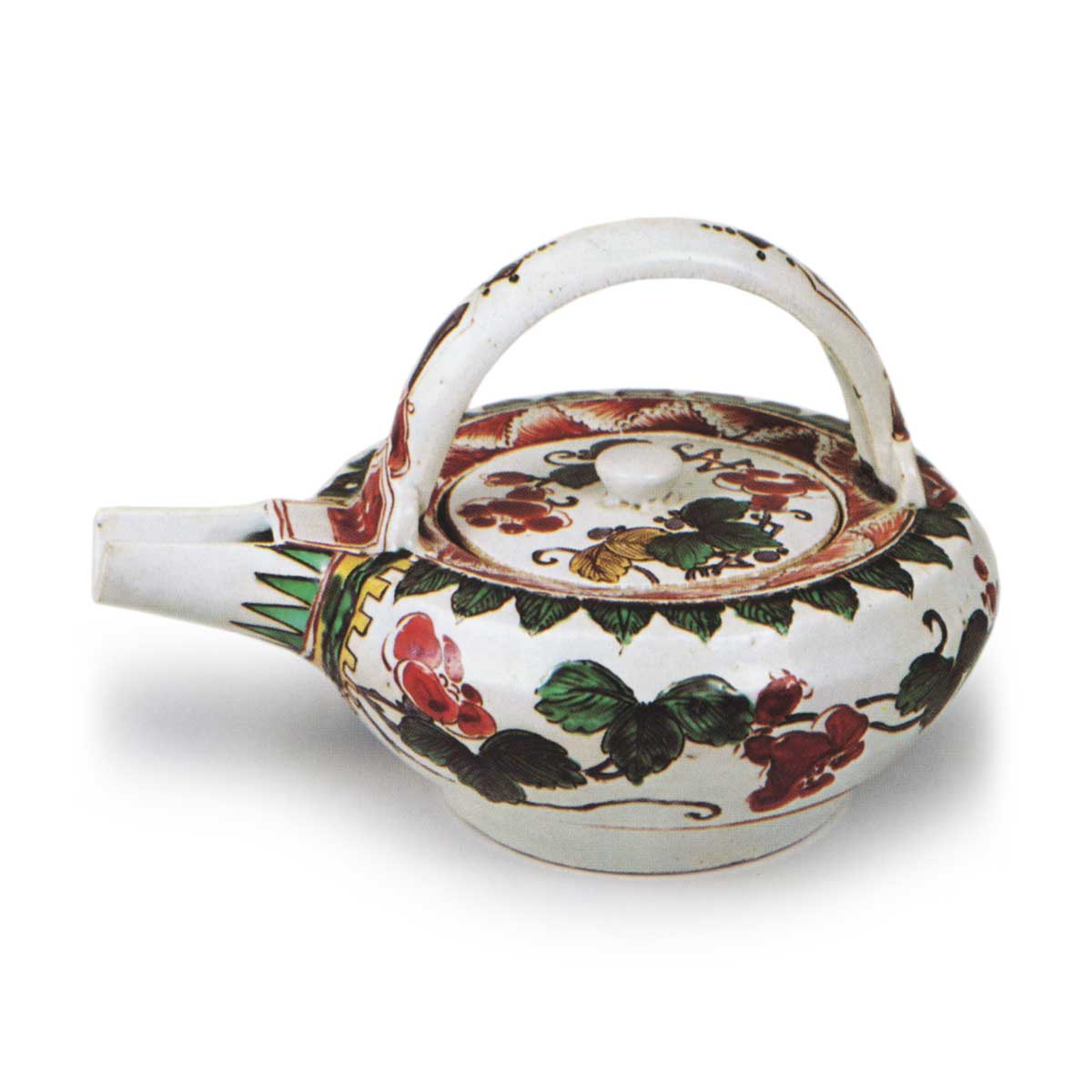 古九谷色绘牵牛花纹酒壶 古九谷古九谷色绘牵牛花纹酒壶 2025.10.15 古九谷色绘牵牛花纹酒壶 总高13.5厘米 高7.0厘米 口径8.9厘米 宽20.5厘米 底径10.3厘米MOA美术馆器形与前图相似,但肩部收面,底无足,高台内侧略加深凿,盖面与器身饰有朝颜般的蔓草花纹,口沿环绕南京赤绘中常见的波头状锯齿纹。彩绘的红绿调色浓郁,作风雅致。虽弓形手柄的酒壶、手盆等器物多饰青花纹样,此器背部却以紫色绘制璎珞纹样。