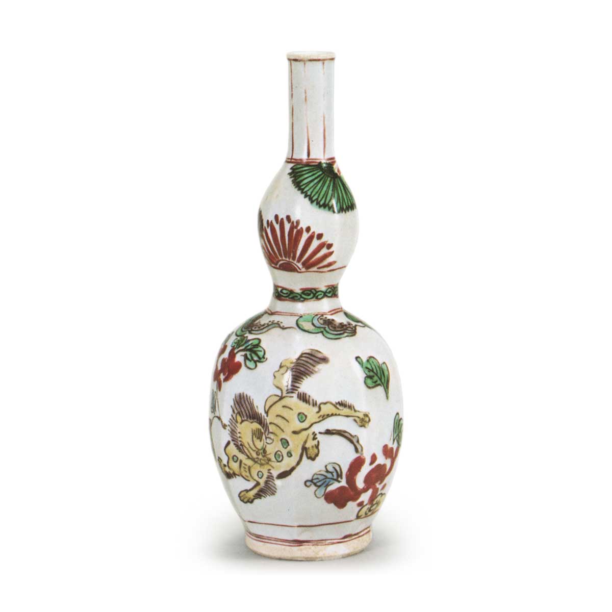 古九谷色绘牡丹狮子瓢形酒壶 古九谷古九谷色绘牡丹狮子瓢形酒壶 2025.10.15 古九谷色绘牡丹狮子瓢形酒壶 高20.5厘米 口径3.9厘米 胴径7.6厘米 底径5.1厘米瓢形酒壶中多有饰唐狮与牡丹者,此件堪称其中精品。