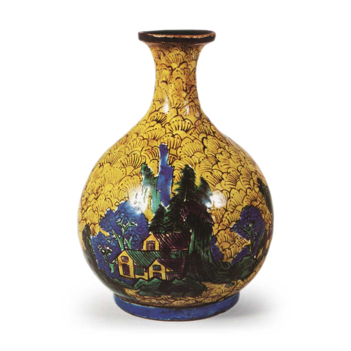 古九谷色绘山水家屋纹酒壶 古九谷古九谷色绘山水家屋纹酒壶 2025.10.15 古九谷色绘山水家屋纹酒壶 高13.2厘米 口径4.0厘米 胴径10.4厘米 底径6.7厘米青手古九谷酒壶实属罕见之物,此乃初见之作。酒壶身饰以山水家屋纹样,底施黄釉,而浓郁的上彩色调乃青手古九谷特有的风格,高台侧面亦施以绀青釉。