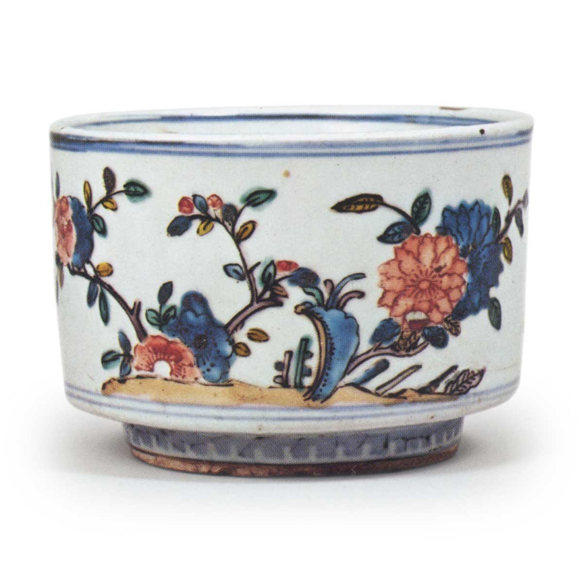 古九谷色绘菊纹茶碗 古九谷古九谷色绘菊纹茶碗 2025.10.16 古九谷色绘菊纹茶碗 高6.4厘米 口径9.1厘米 底径6.1厘米古九谷风格的抹茶茶碗实属罕见。此碗采用干山茶碗等典型的半筒形,碗身一侧绘有枝叶舒展的菊花与樱花图案,背面则描绘山水景致并点缀蝴蝶。碗底内侧以青花书写“角福”铭文。