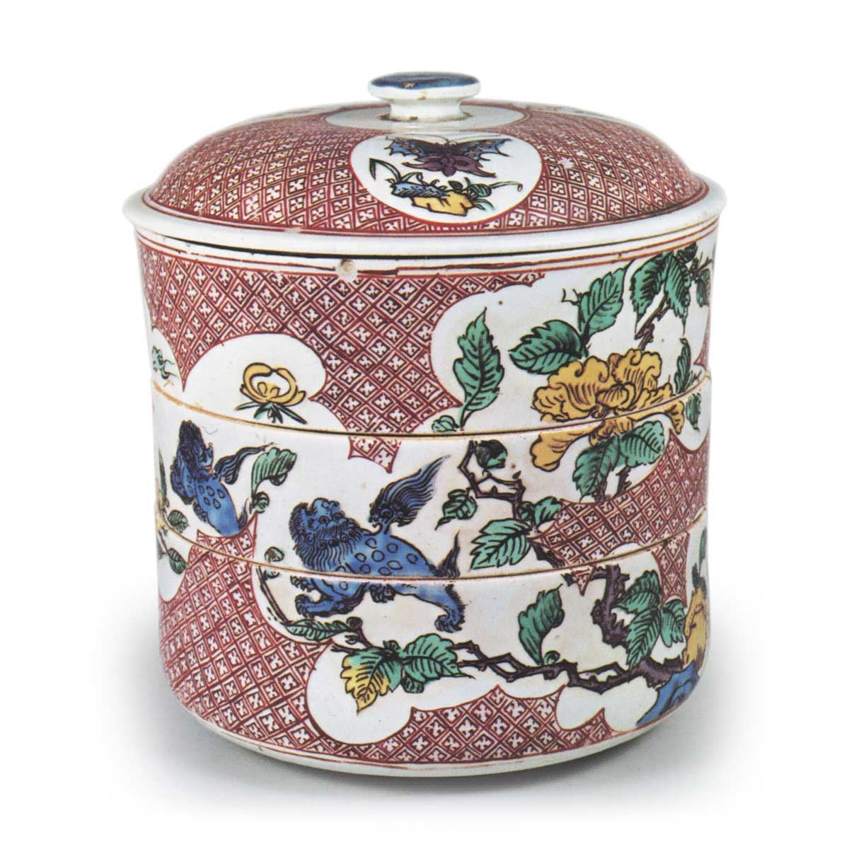 古九谷色绘牡丹狮子纹重盖物 古九谷古九谷色绘牡丹狮子纹重盖物 2025.10.16 古九谷色绘牡丹狮子纹重盖物 高19.4厘米 口径16.8厘米 底径10.7厘米作为古九谷样式的色绘作品,此重盖物极为罕见,堪称绝无仅有的珍品。