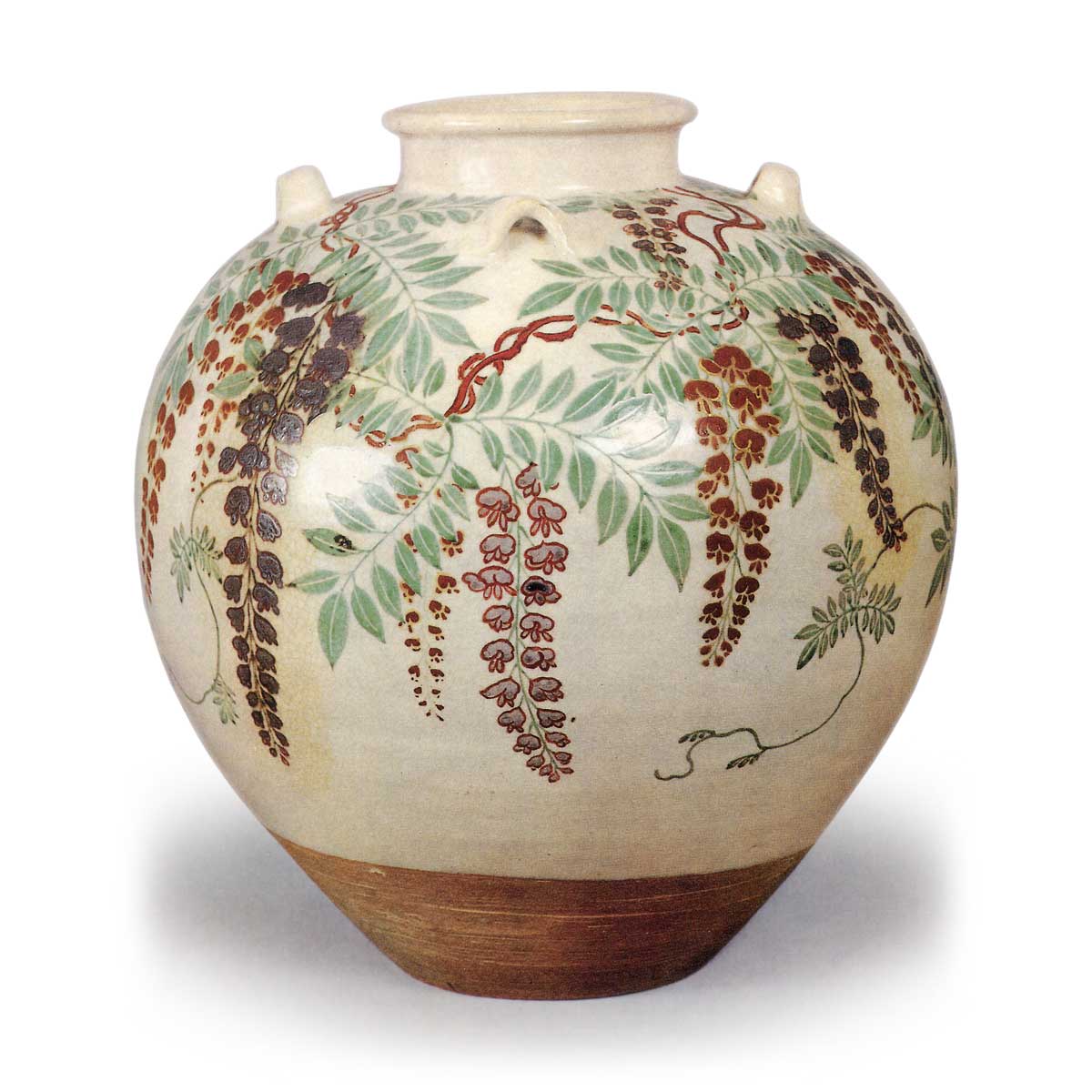 日本叶形茶壶的烧制始于室町时代中期,当时备前窑与濑户窑仿制唐代茶壶以供赏玩,此后信乐、伊贺、 唐津等窑也曾烧制此类器物。然而至江户时代,仁清制作的茶壶以装饰性极强的彩绘技法,展现出前所未有的华美优雅风貌,彻底颠覆了人们对茶壶的既有认知,堪称开创全新审美境界的杰作。它亦可视为象征江户前期京都风雅文化的工艺典范。