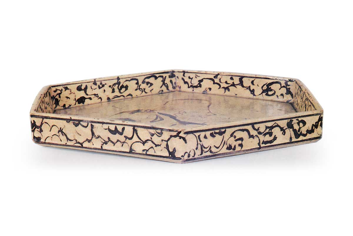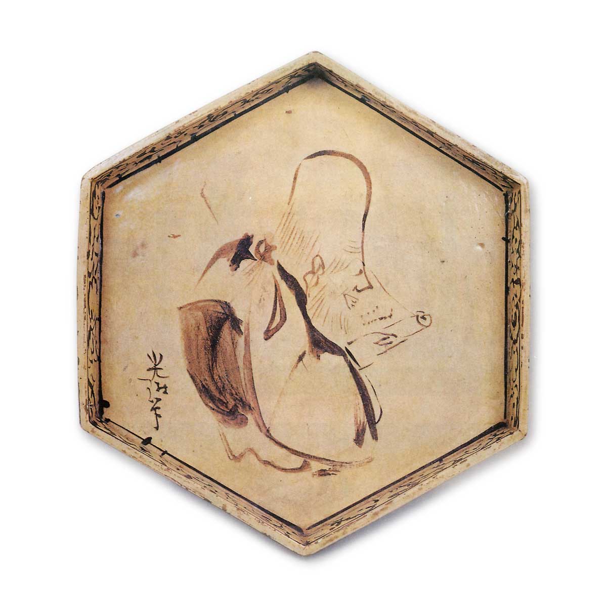 这件六角平盘作为光琳绘制的合作代表作亦享誉盛名。素地采用柔软白陶胎,经模具成型后全面施白釉,其上以锈彩绘饰,再覆透明釉进行低温烧制。