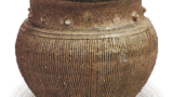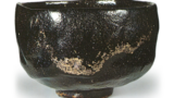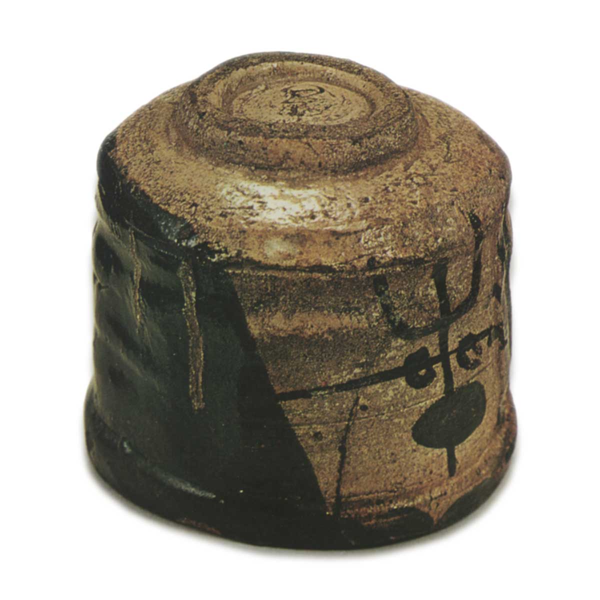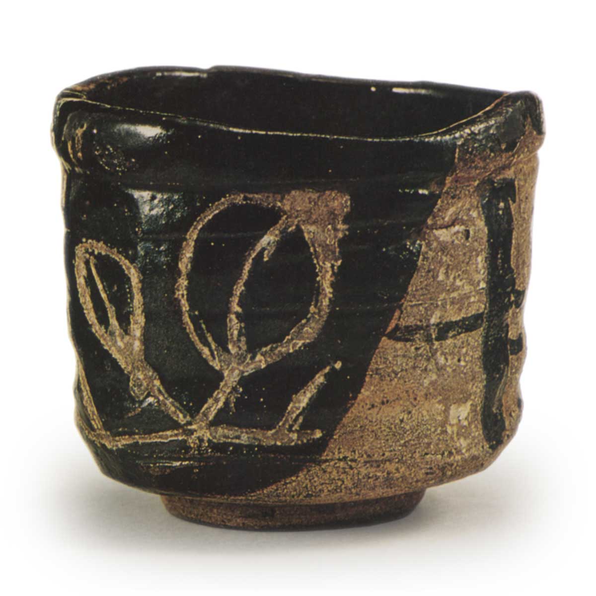 织部烧有多种类型,例如蓝织部、鸣海织部、红织部、黑织部、织部黑、彩绘织部、鼠织部、伊贺织部和唐津织部,但像这种圆柱形茶碗一样,在白色区域带有黑色釉面和铁质图案的织部烧被称为黑织部。 而通体黑色釉面的则被称为“黑织部”。关于“冬晴”这个名字的由来,我们并不清楚,但它确实是织部风格创新且引人注目的代表作,让人感觉它就是织部本人所作。它是诞生于热闹的桃山时代的杰作。