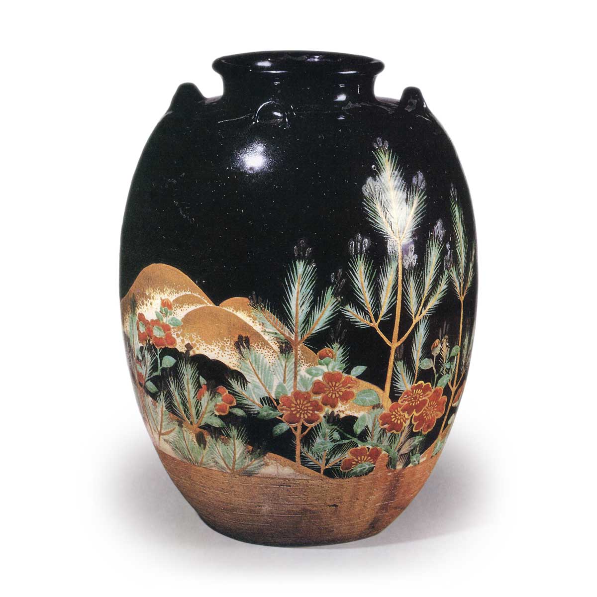与图5相同,除图案区域外均施黑釉呈现漆黑效果,壶身以远景山峦为背景,描绘青松、樱花、山茶等景致。黑釉底衬托下图案鲜明夺目,作为吉祥纹样亦属罕见构图。