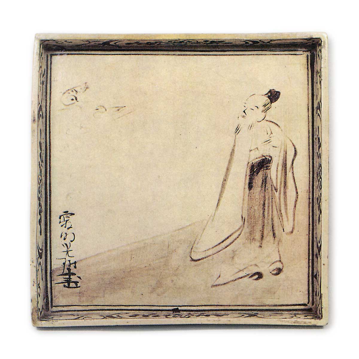 此为模具成型之方形平盘,白釉底上施锈彩绘饰,其色泽略显淡薄近褐。盘面左上斜向描绘薄土坡,两羽鸥鸟游弋其间,右侧则有高士观鸥之姿,此题材据考或为宋代黄庭坚《观鸥图》。左下角题写的光琳落款为“寂明光琳画”。垂直立起的盘缘内外侧中央开窗,窗内绘唐草纹样花卉,余白处环绕云唐草纹。