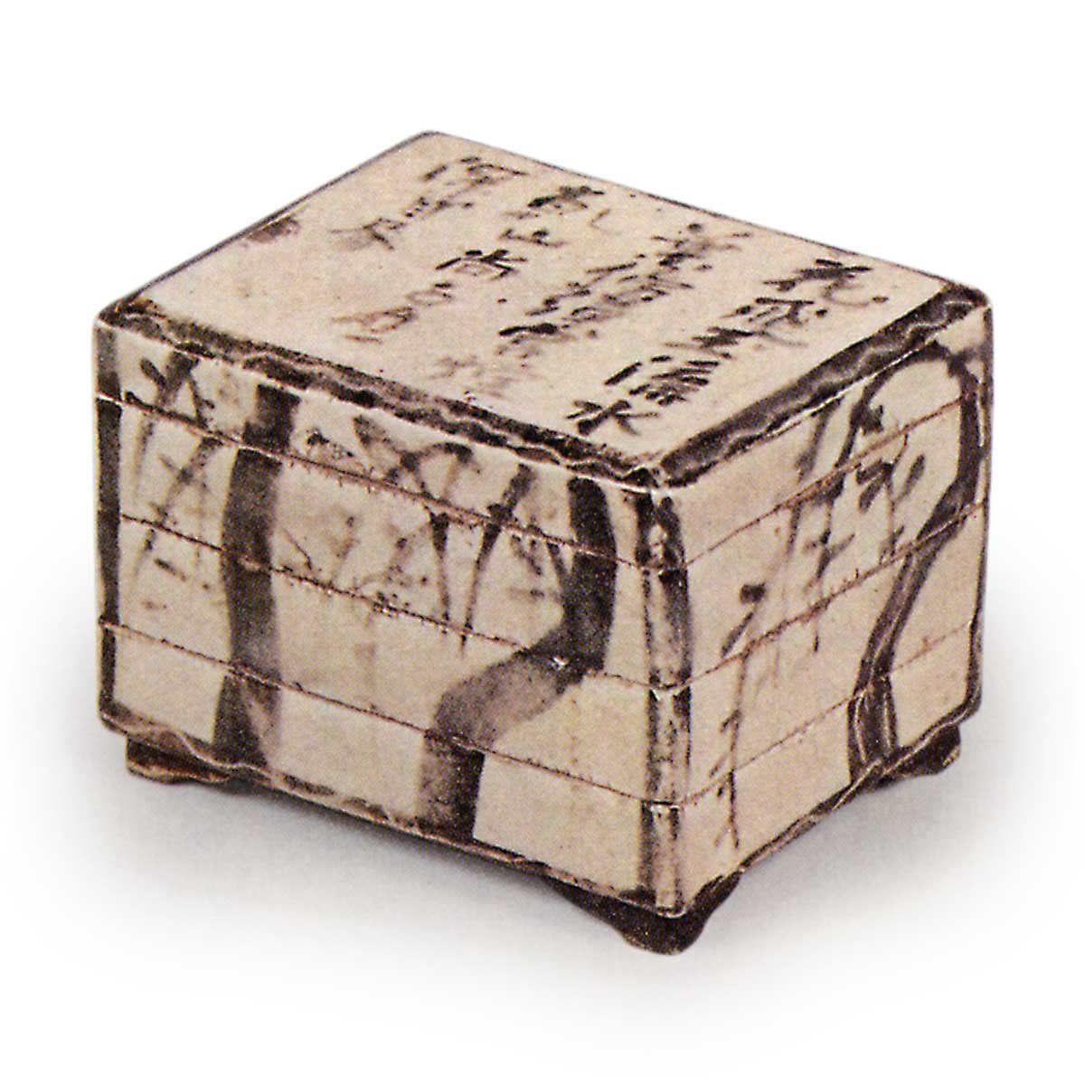 乾山銹絵汉宫春图香合 乾山乾山銹絵汉宫春图香合 2025.10.16 乾山銹絵汉宫春图香合 高5.3厘米 口径5.3×6.8厘米 四足大和文华馆此器原为香盒所制,其三层叠叠的器身覆以盖子,呈长方形,实属罕见。器身所有棱角均饰以框线,四面绘有萌芽的柳树,盖甲题有诗文及落款“花飞玉沟水 叶仿汉宫烟 乾山尚古斋深省书”,外底白釉底上书有“正德年制”年款。各层接合处仅施白釉,器身与盖子内外均覆透明釉。此器非与光琳合作之作,绘画风格似为乾山所作,其笔法与纸本墨绘、锈绘及青花小碗上的柳枝纹样如出一辙.