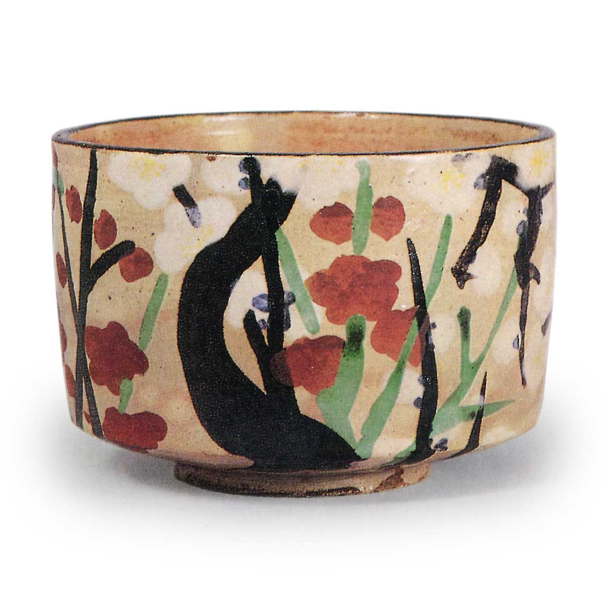 碗口边缘与梅树枝干采用铁绘颜料打底,白泥绘制的花朵及以钴蓝点绘的枝条同样经打底处理,施透明釉后经本烧,再以红、绿、黄三色上彩描绘花朵、枝条及花蕊。底彩与上彩的运用中蕴含着乾山独特的匠心,形成雅致的绘纹样。釉面呈现俗称“御本”的淡红色斑纹,赋予器物更柔和的质感。