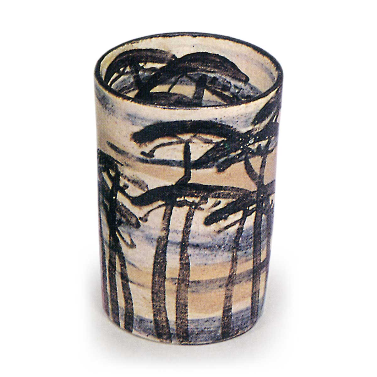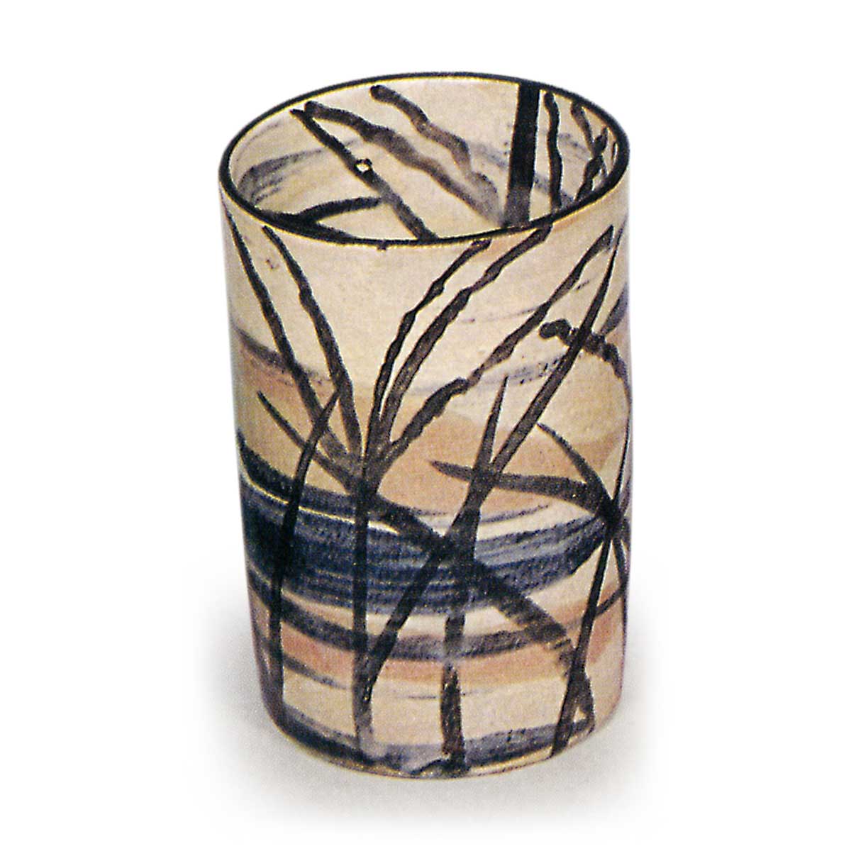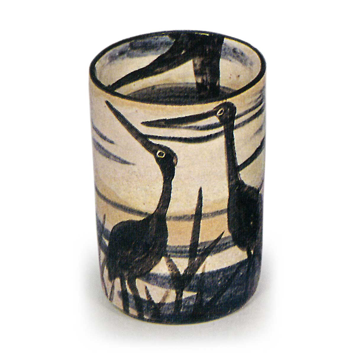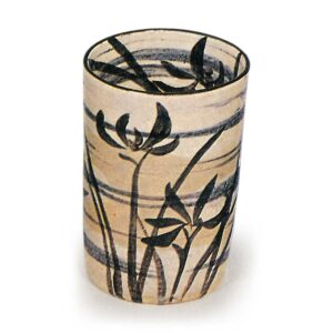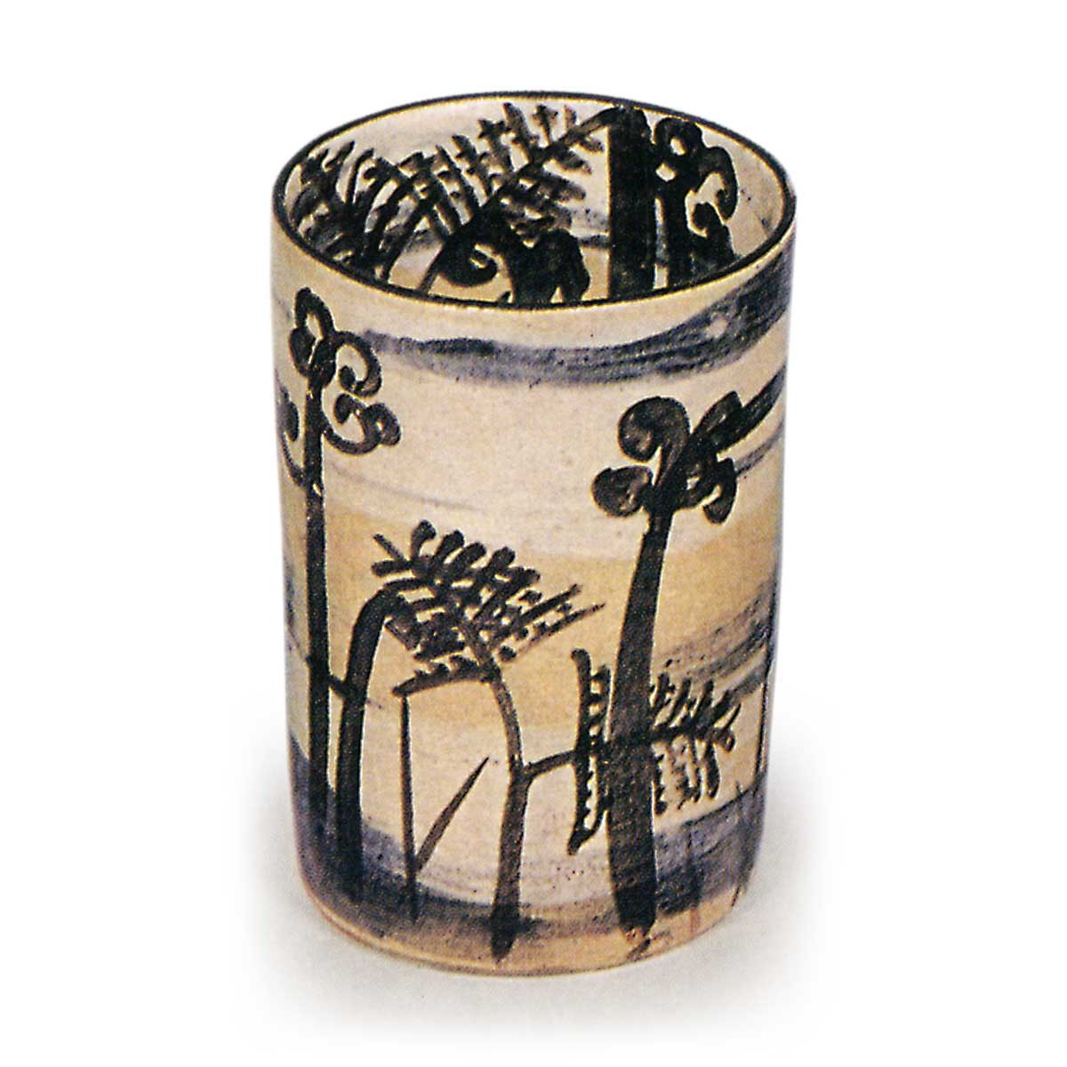 此筒形小碗堪称现存同类器物中的巅峰之作,烧制效果与保存状态皆堪称绝佳。十件成套器皿各具特色,内外均以白刷毛底料为基底,采用染付与铁绘技法绘制芦鹤、芝草、蕨叶、春兰、松树、枪梅、柳枝、帆船、竹叶、菊花等纹样。