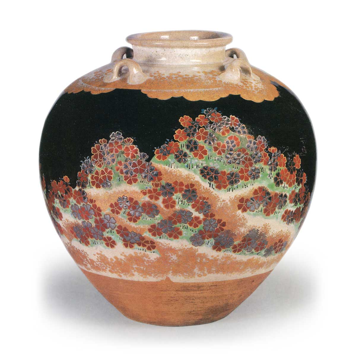 此茶壶的首要特色在于,与《色绘若松远山图茶壶》相同,其局部施以俗称“仁清黑”的釉料。漆黑釉层的覆盖,使肩部源氏云纹与主体樱花盛放的吉野山意象鲜明凸显,更添莳绘般的深邃韵味。