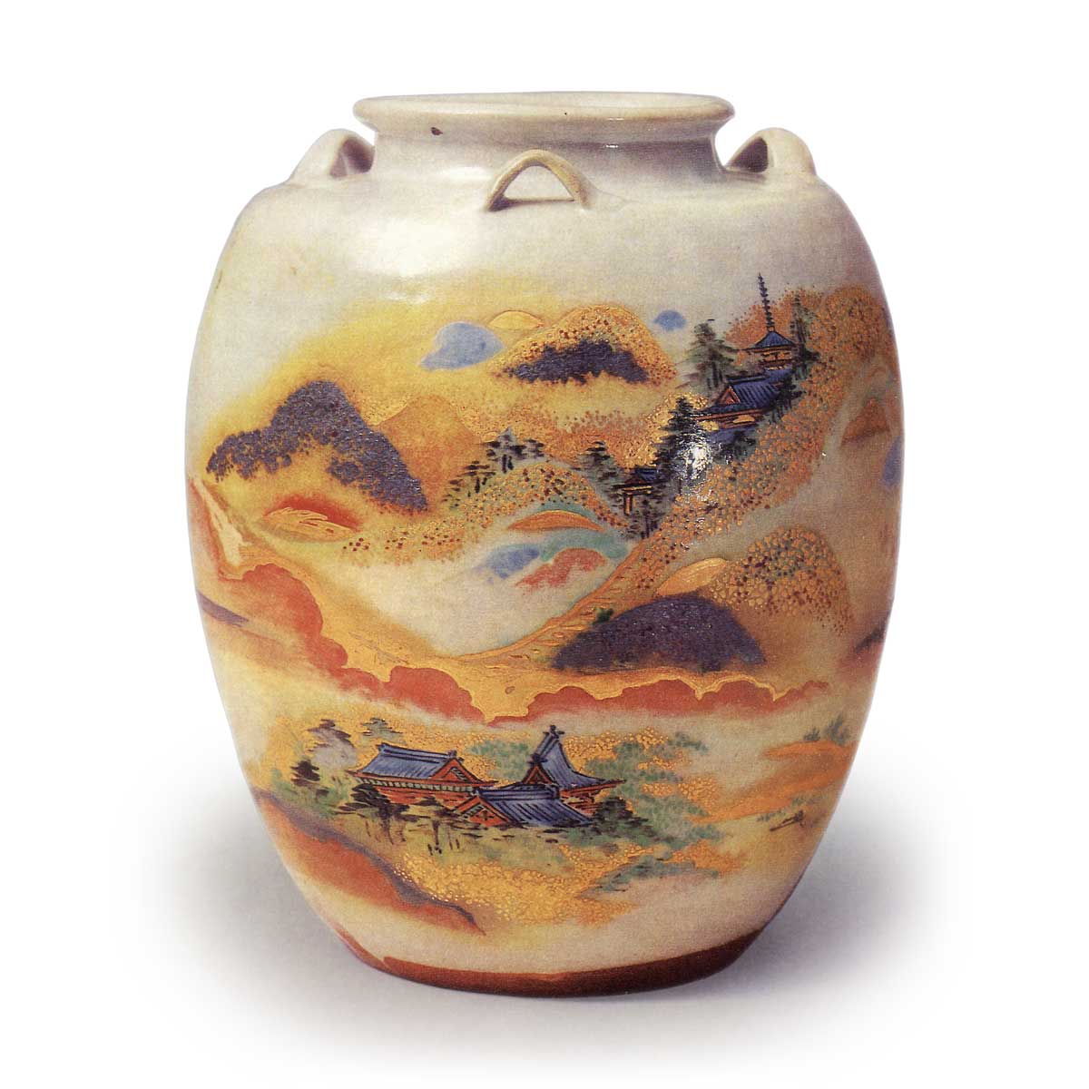 自壶口至近底部的白浊釉色柔和烧成,壶身全面展现出夕阳映照下的楼阁山水春景,俗称“山寺图”。此壶绘饰在仁清彩绘茶壶中最具绘画韵味,笔法尽显狩野派风范,或许正是探幽亲绘。正面以利落笔触上下勾勒黑漆堂宇,背面则以山峦与薄雾简练收束,金泥、浅红与青色的运用恰到好处,构筑出丰盈的画面。