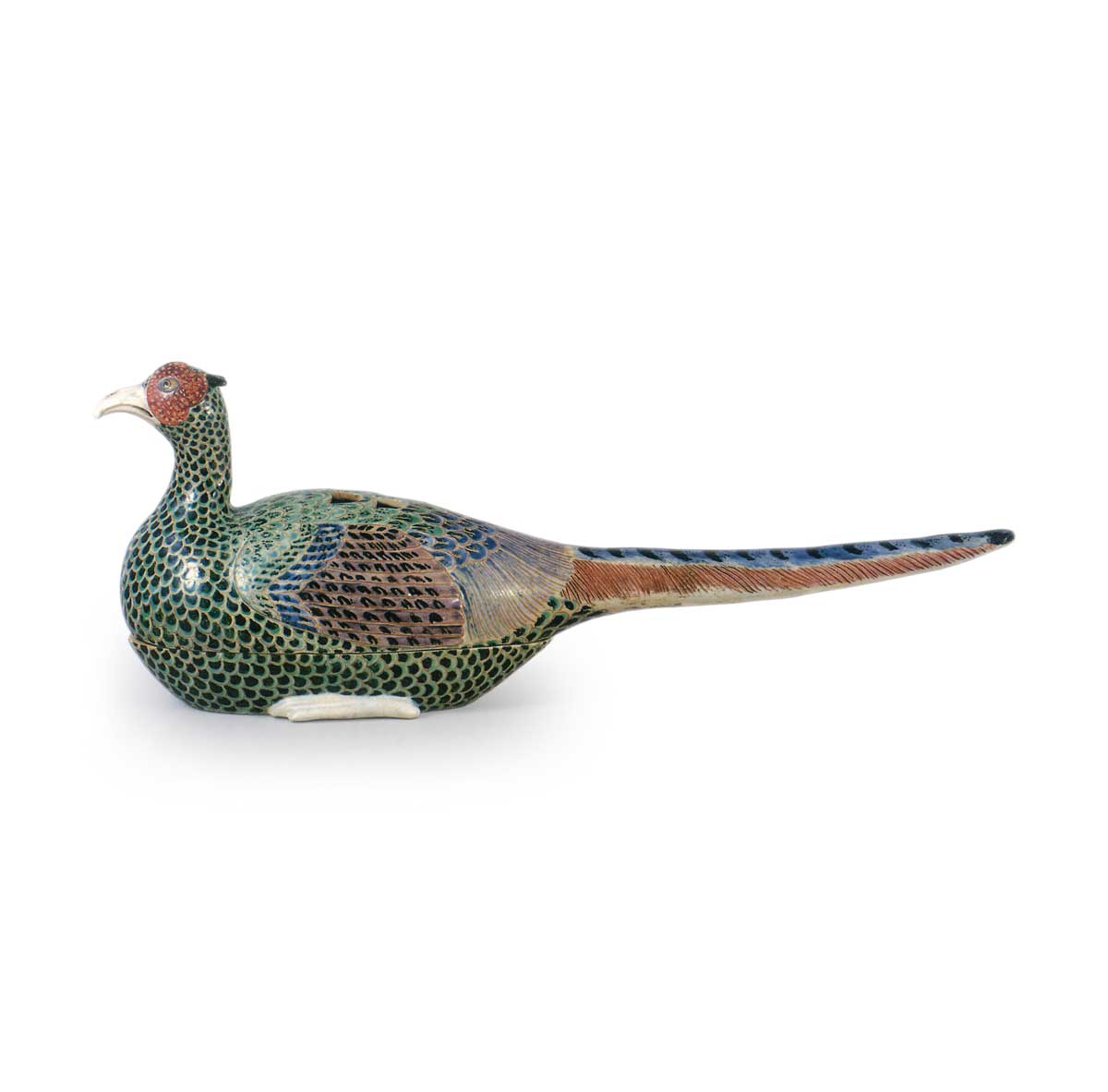 仁清不仅是轆轤名匠,在雕塑类细工器物方面亦展现出非凡技艺。由于现今已无法确知御室烧仁清窑场的具体组织形态,故难以断定这位轆轤大师是否亲手制作了这些精妙器物。但若确属同一人所作,则堪称近世第一名匠亦不为过。一只华美的雄雉被精妙地装饰化为香炉。