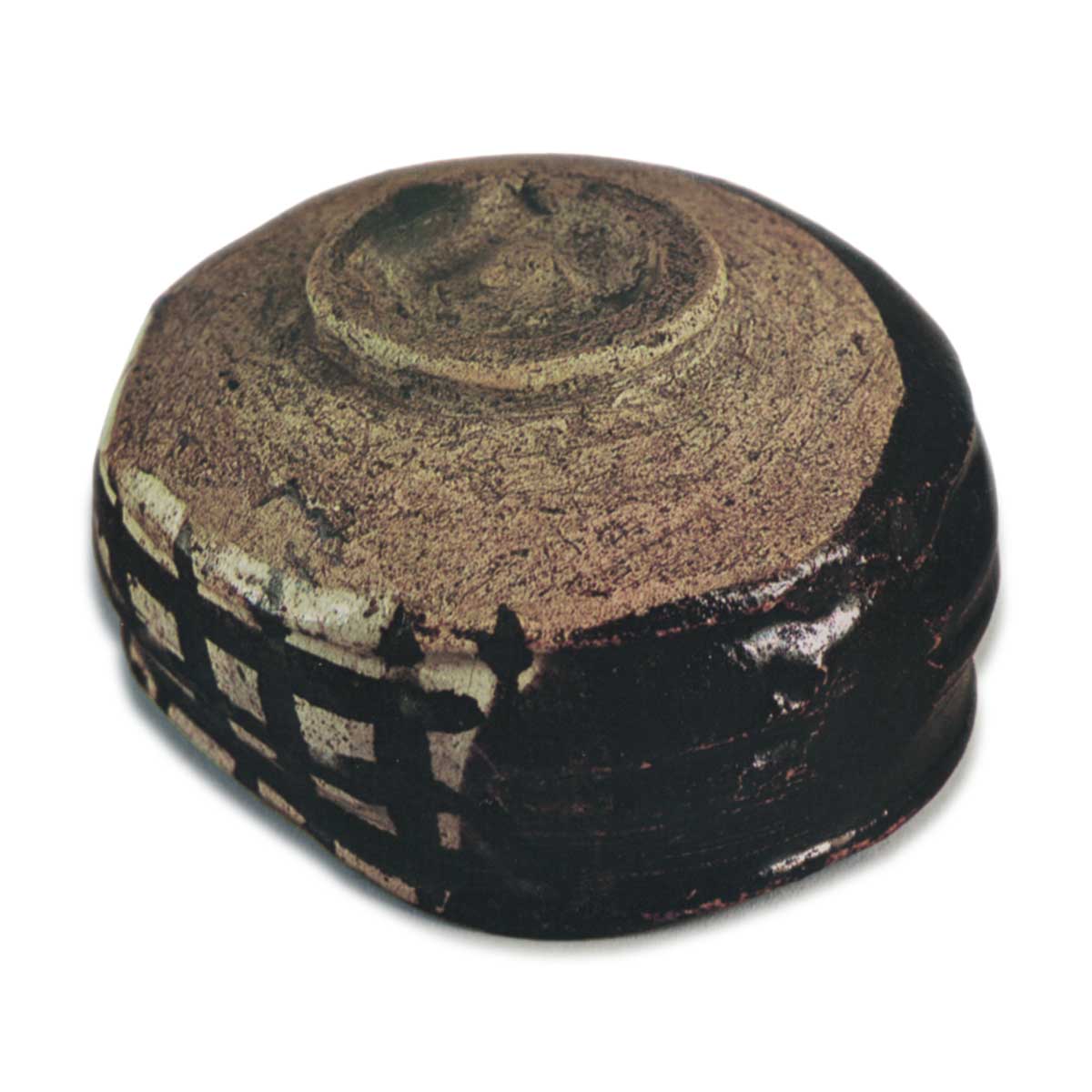 器皿的内外两侧分别有格子图案,内部有横条纹图案,这是这种黑色织部烧陶器的独特表现。没有图案的区域内外都涂有黑色釉,图案则涂在裸露的陶土上,然后在涂有图案的区域涂上一层薄薄的基于长石的白色釉。