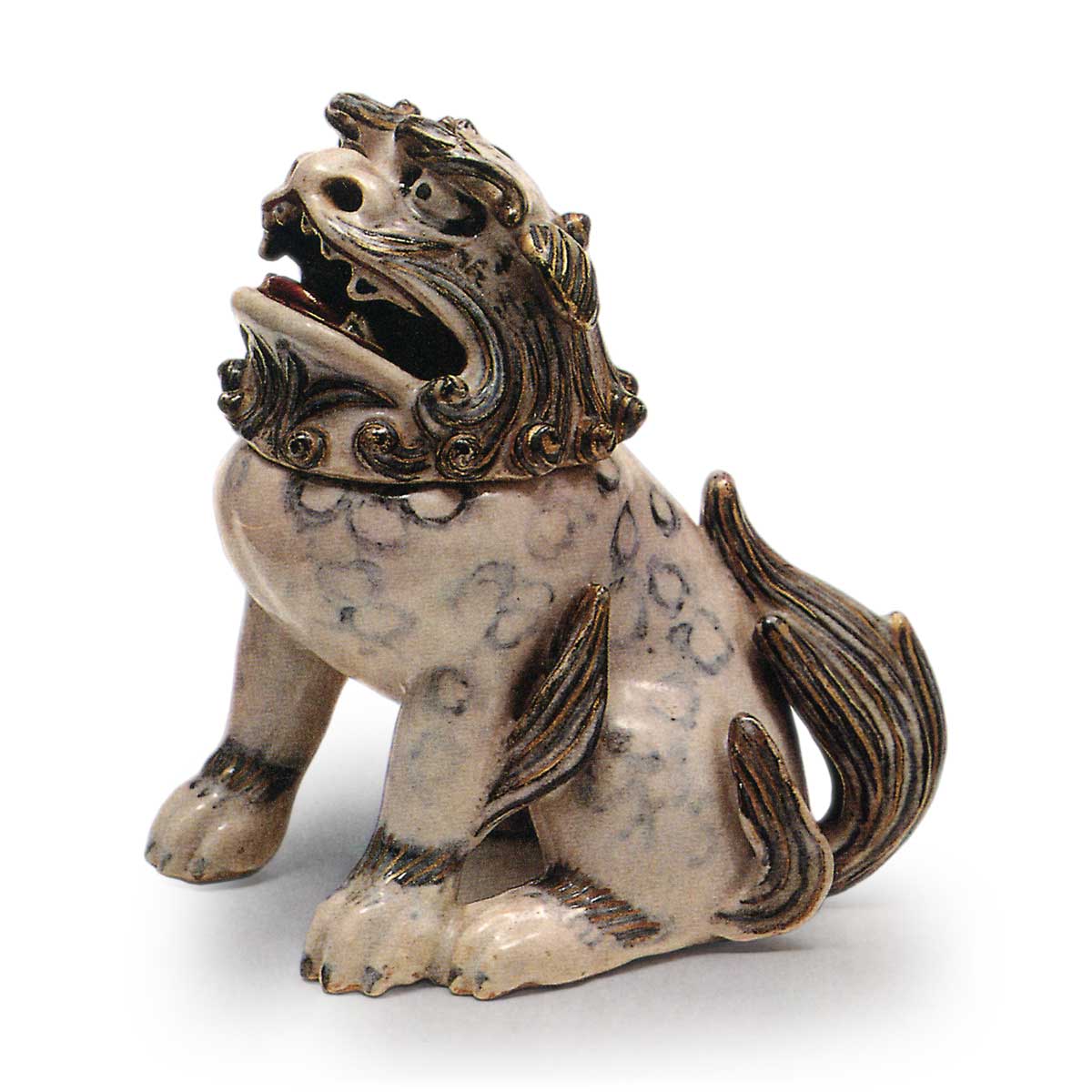 仁清色绘狮子香炉 仁清仁清色绘狮子香炉 2025.10.16 仁清色绘狮子香炉 总高16.4厘米 口径6.2厘米 左右16.0厘米此香炉造型为鬃毛咆哮的唐狮。器身分为头部与躯干,头部兼作盖子。器身内壁、外底及盖口处露出素坯,其余全面施以乳白色釉,釉面质地柔润,烧制效果堪称理想。以锈彩与钴蓝底彩勾勒狮鬃与卷曲毛发,狮鬃之上覆以金泥上彩。仅在口内点缀红色,整体以淡雅色调塑造唐狮形象,由此可见仁清独特的审美意趣。底面中央捺有“仁清”瓢形小印。