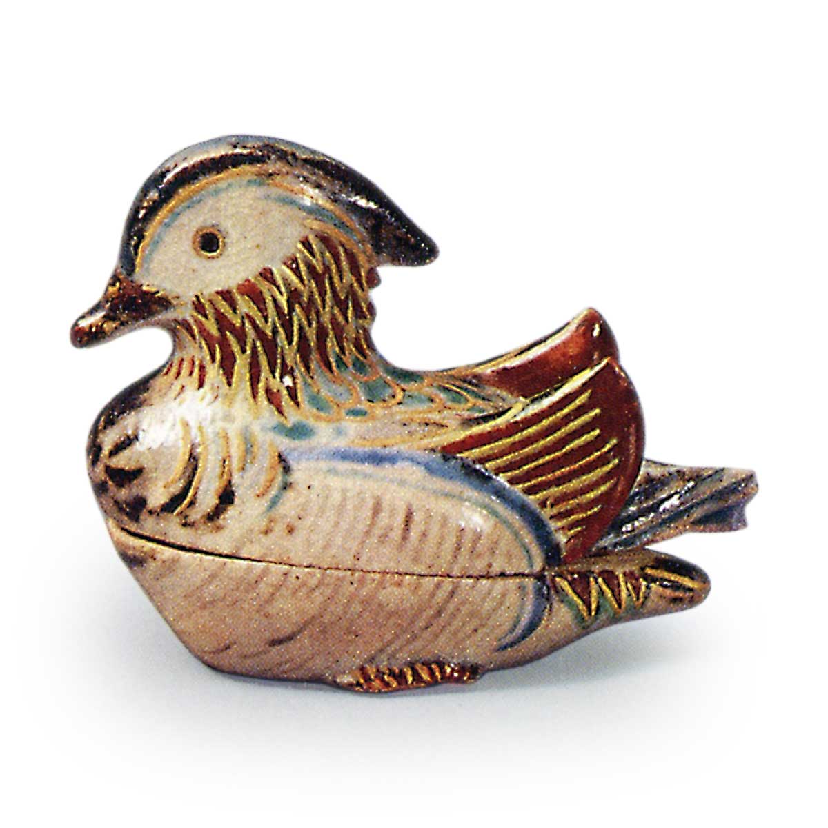 仁清色绘鸳鸯香盒 仁清仁清色绘鸳鸯香盒 X Facebook Hatena Bookmark LINE Pinterest 复制 2025.10.16 仁清色绘鸳鸯香盒 高5.2厘米 宽6.0厘米藤田美术馆仁清留下了许多优雅的香盒作品。虽属小品,却多展现其精湛技艺。虽见过数件鸳鸯题材的香盒,但此作在华丽中更显张力,堪称最杰出的典范。器身与盖面均施白浊釉,釉面布满细密釉裂纹。头部与背羽饰以底彩锈彩,上彩则运用赤、金、绿、青等色,淋漓尽致地展现雄鸳鸯的艳丽风姿。盖底与器底露胎,器内施釉,未见印记。据传此物原为山科毘沙门堂宫门遗址所藏爱器。