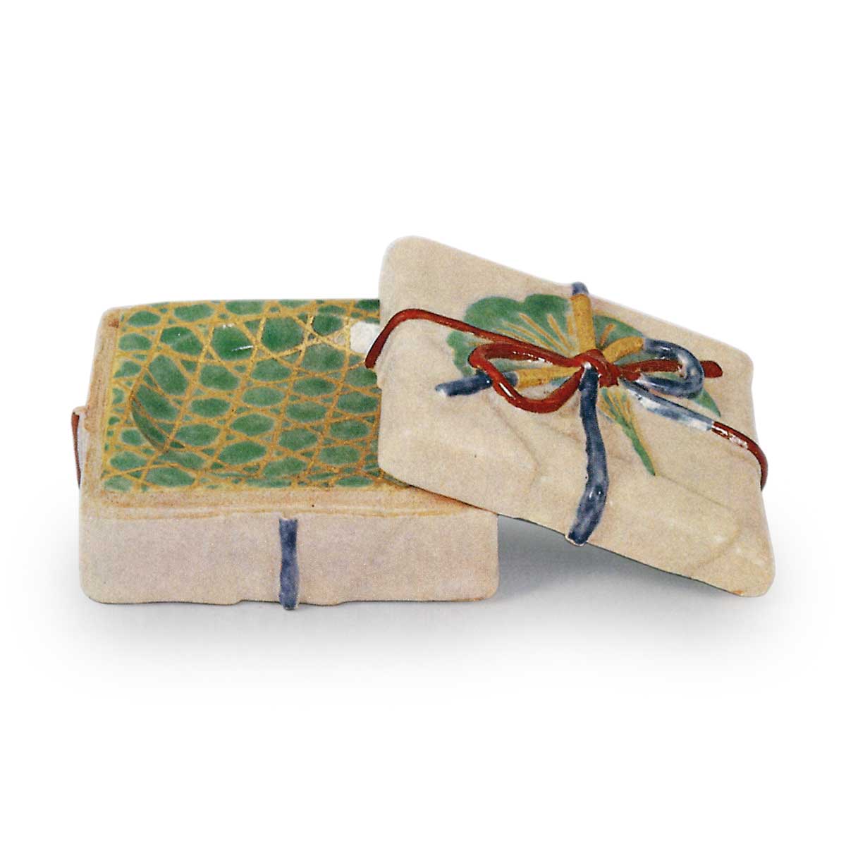 仁清作品的显著特色在于,其设计多遵循宫廷传承的有职故实. 此香盒俗称玄猪包香盒。所谓玄猪包,乃旧历十月上亥日宫中为祈求无病息灾所制玄饼,以褶纸包裹后覆银杏叶,以水引绳系结,由天皇或皇后下赐之物。本品即以该玄猪包为原型制成的香盒。迄今所见仁清制作的玄猪香盒仅两件,而此作实属鲜为人知之珍品。