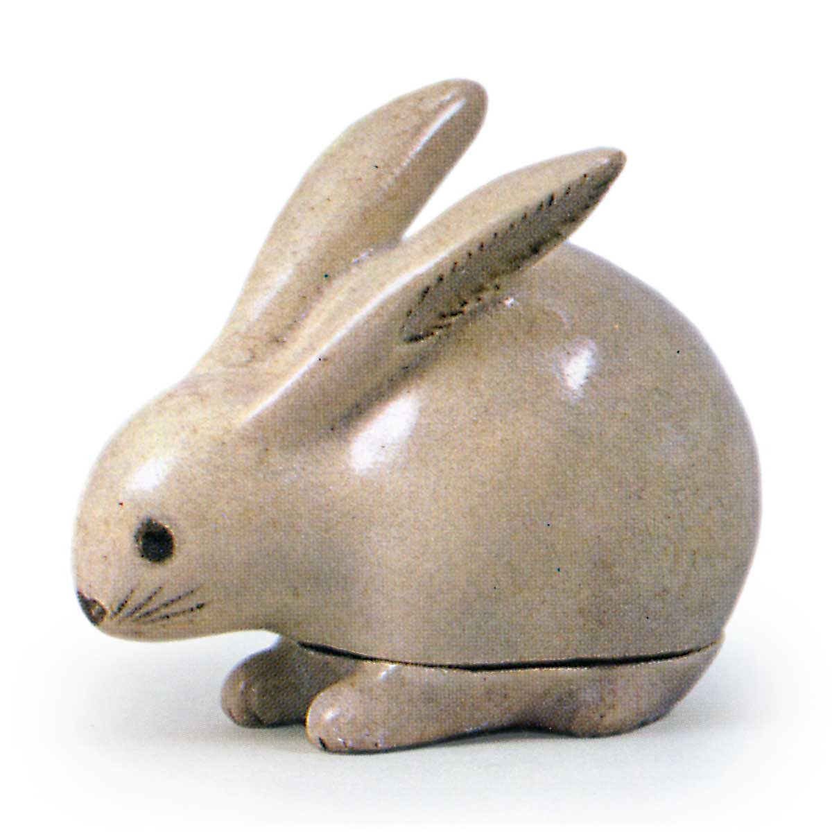 仁清锈绘兔香合 仁清仁清锈绘兔香合 2025.10.19 仁清锈绘兔香合 高6.7厘米 长7.4厘米此香合以白兔为造型,其眼、口、胡须以锈绘技法表现,耳部亦施以锈绘并覆以淡青釉。平底中央捺有仁清小印。与本香合作风相近的大型香炉亦流传至今。