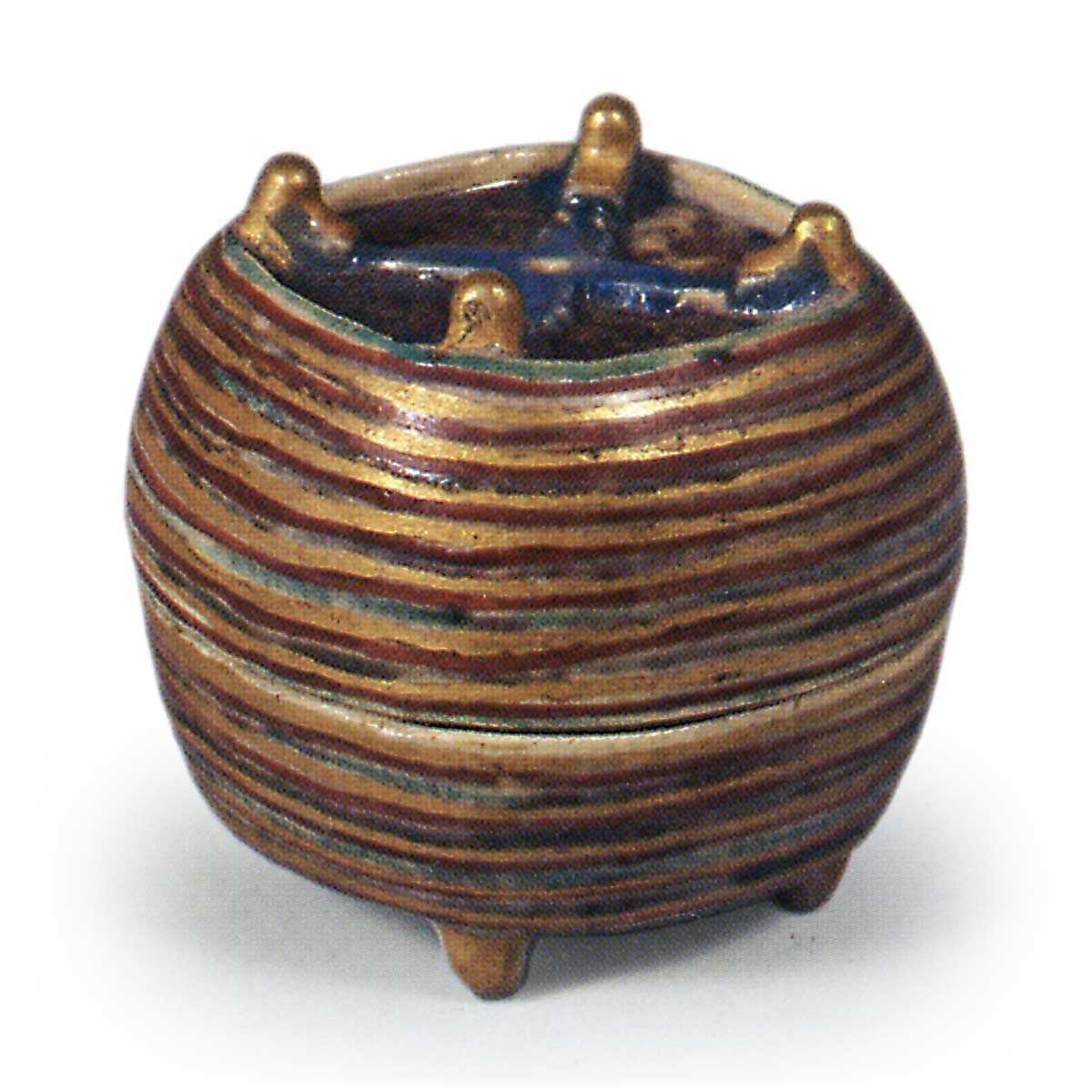 仁清彩绘卷轴香盒 仁清仁清彩绘卷轴香盒 2025.10.19 仁清彩绘卷轴香盒 高5.5厘米 胴径5.5×5.6厘米仁清另作有同样采用线卷纹样的盖置,这些亦属御所所喜之物。自盖至身全面施白釉,以锈彩、金、赤、薄绿、青、紫等色随意勾勒丝线纹样,身内侧则施绿釉。底面虽有仁清的幕印,但因釉色覆盖而难以辨识。盖底与器身接合处露出素坯。内盒盖面题有“わくノ香合”字样,由此可见此类器物昔日并非称作“糸巻”,而是称为“わく”。