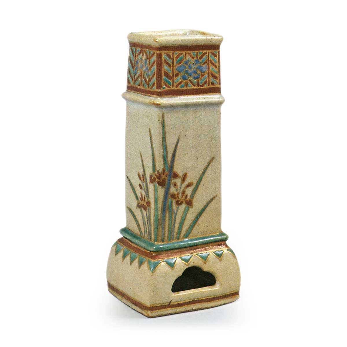 仁清色绘菖蒲纹立 仁清仁清色绘菖蒲纹立 2025.10.19 仁清色绘菖蒲纹立 高14.4厘米 口径3.6×3.9厘米 底径5.2×5.5厘米畠山纪念馆此器形似唐铜或七官青瓷杓立,应为仿作。筒形四面,上部设阶,台座两侧饰州滨形透雕。菖蒲纹饰前后两面贯穿描绘,素底内侧捺有仁清蚕茧形印章。此类器物实属罕见珍品。