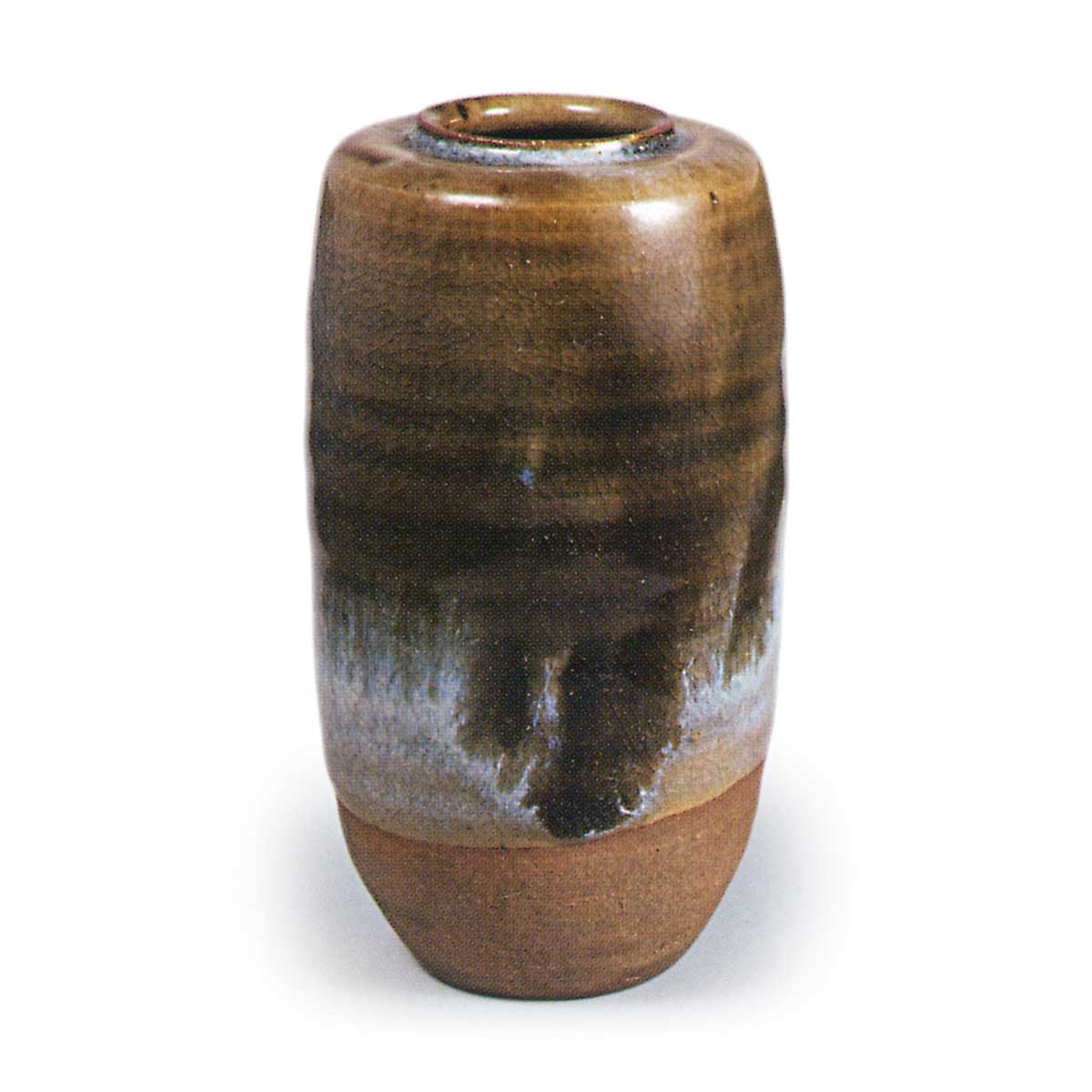仁清飴釉肩冲茶入 仁清仁清飴釉肩冲茶入 2025.10.192025.11.14 仁清飴釉肩冲茶入 高9.4厘米 口径2.7厘米 底径2.8厘米此为细长挺拔的肩冲形茶入,口沿上翘幅度较低。自口沿至器身下缘施以琥珀釉,器身下缘则覆白浊釉,下缘处见素土,高台处施线状釉,其左侧捺有幕印。此类略显高挑的茶入为仁清所偏爱,亦可能是依宗和喜好而作。据传箱盖表面的「於むろ茶入」题字乃宗和手迹。