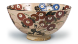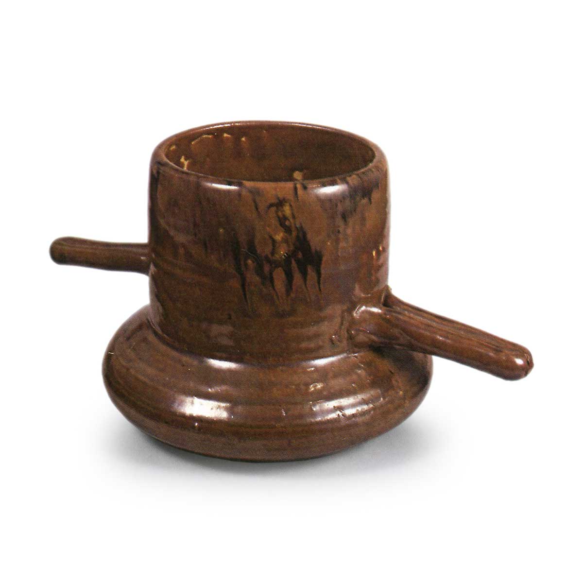 仁清濑户釉臼形水指 仁清仁清濑户釉臼形水指 2025.10.192025.11.14 仁清濑户釉臼形水指 高15.6厘米 口径11.2~12.1厘米 底径10.9厘米仁清的水指多为异形设计,此件则以石臼为原型创作。筒状器身两侧附有大型把手,从内至外厚涂濑户釉,釉色呈现黑色斑驳纹理形成独特景致。器身下缘至平底处露出素坯,底面左侧捺有仁清大印。