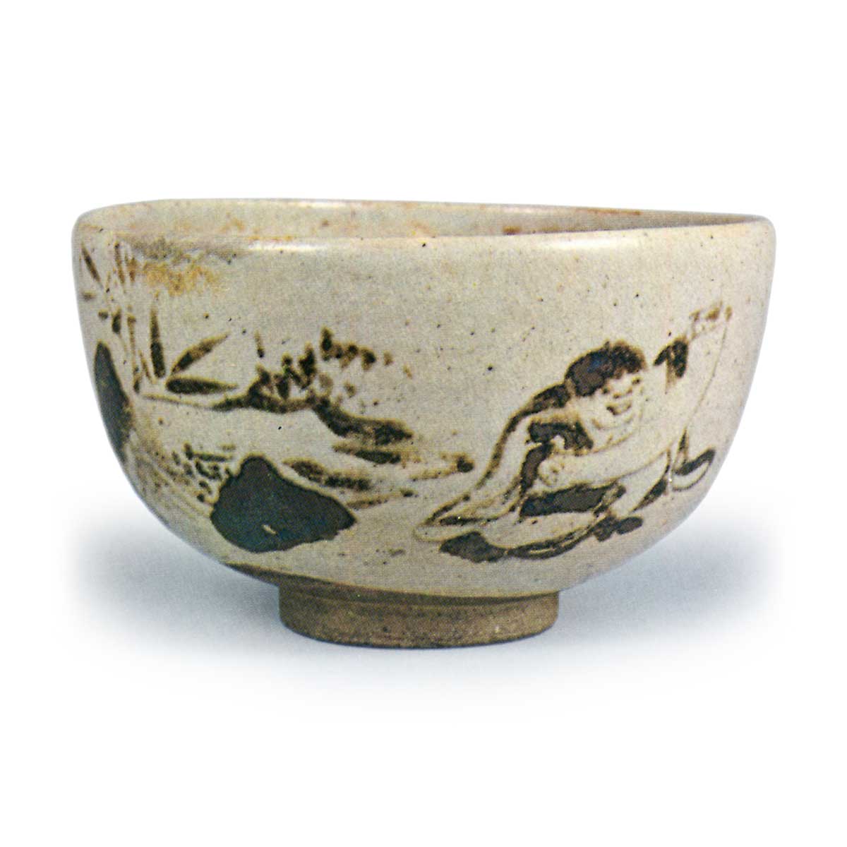 仁清锈绘寒山拾得图茶碗 仁清仁清锈绘寒山拾得图茶碗 X Facebook Hatena Bookmark LINE Pinterest 复制 2025.10.19 仁清锈绘寒山拾得图茶碗 高7.5厘米 口径11.9~12.7厘米 底径4.9厘米鹿苑寺此茶碗原属与御室烧渊源深厚的鹿苑寺凤林和尚所有,其日记《隔蓂记》中屡次提及御室烧与仁清。碗身呈仁清特有的圆润腕形,高台外露土胎,内刻仁清印章。碗身两侧饰有寒山拾得图,横向绘有竹林与岩石,在仁清锈彩茶碗中堪称绘画艺术最精湛之作。此画作应出自专业画家之手。除高台外整体施白釉,釉面泛着淡淡红晕。