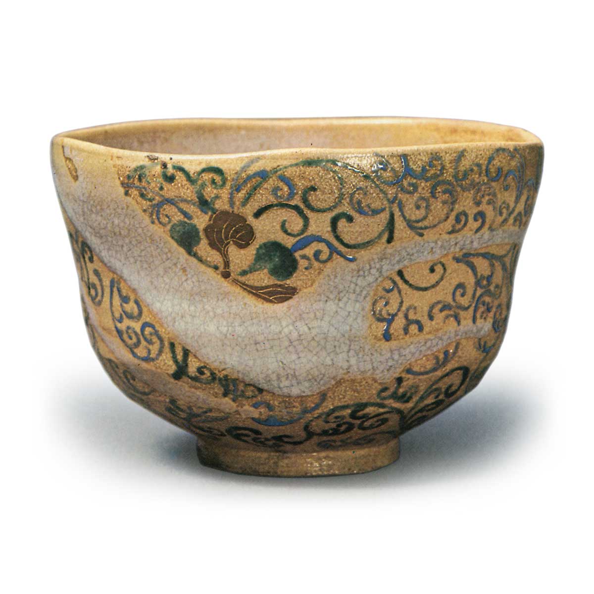 仁清色绘铁线莲唐草纹茶碗 仁清仁清色绘铁线莲唐草纹茶碗 X Facebook Hatena Bookmark LINE Pinterest 复制 2025.10.19 仁清色绘铁线莲唐草纹茶碗 高8.7厘米 口径12.0~12.4厘米 高台径5.1厘米根津美术馆此为典型的宗和风格仁清茶碗,碗身收束,口沿处呈现柔和的起伏。高台采用单薄削制工艺,内壁施白浊釉,外壁局部流淌白浊釉,在烧结素胎上以彩绘技法呈现铁线莲唐草纹样。此类宗和风格彩绘茶碗中堪称杰作之一。高台内侧左方捺有仁清宗和印章。