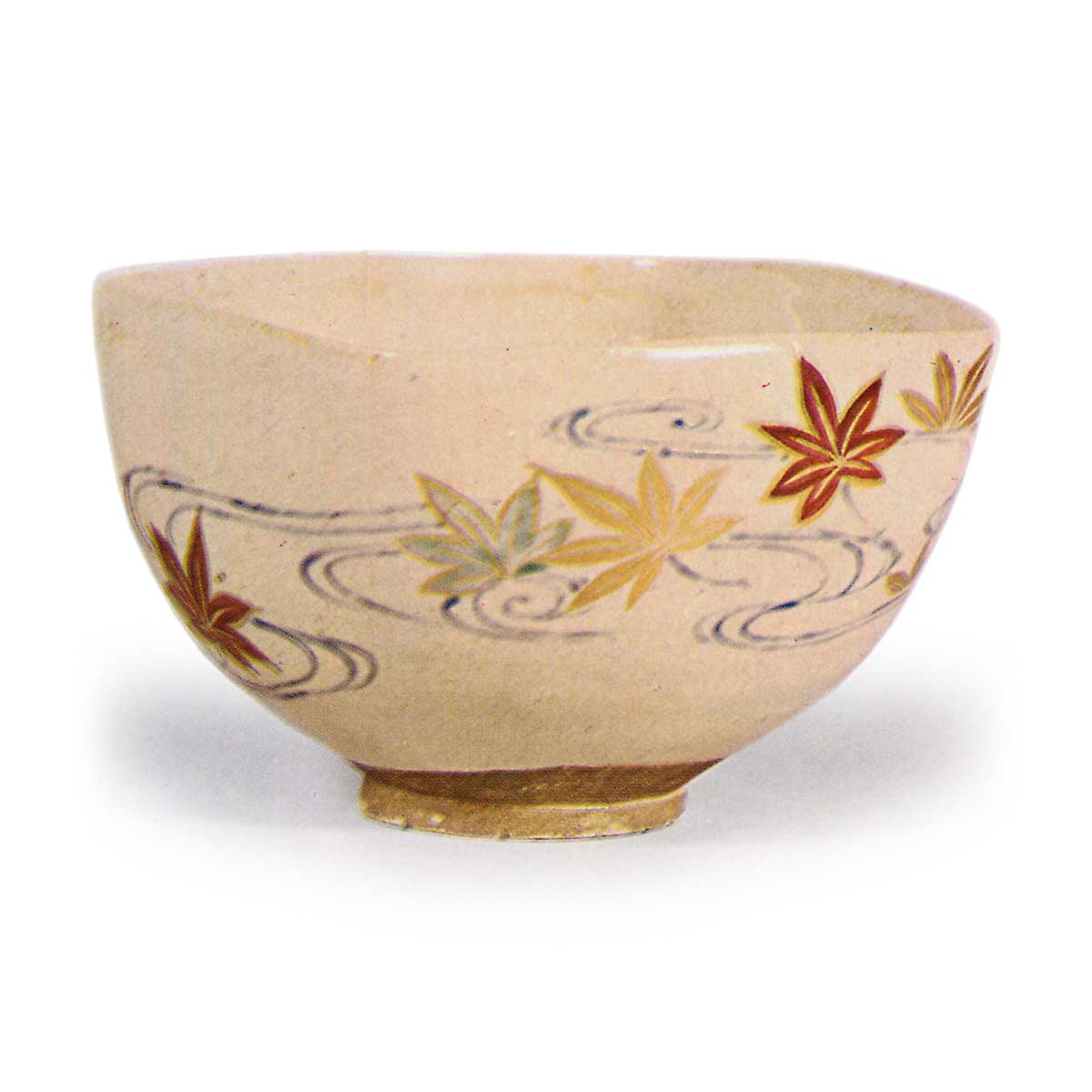 仁清色绘龙田川纹四方茶碗 仁清仁清色绘龙田川纹四方茶碗 2025.10.19 仁清色绘龙田川纹四方茶碗 高7.8厘米 口径11.8×12.1厘米 底径5.0厘米MOA美术馆此茶碗采用宽阔碗形轆轤拉坯成型,碗口四周经压制打磨成抚四方造型,仁清尤为偏爱此类器形。碗身保留高台,通体覆白釉,外侧绘有流水间飘落红叶的龙田川纹样,优雅动人。高台处钤有仁清小印。
