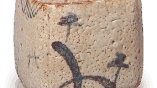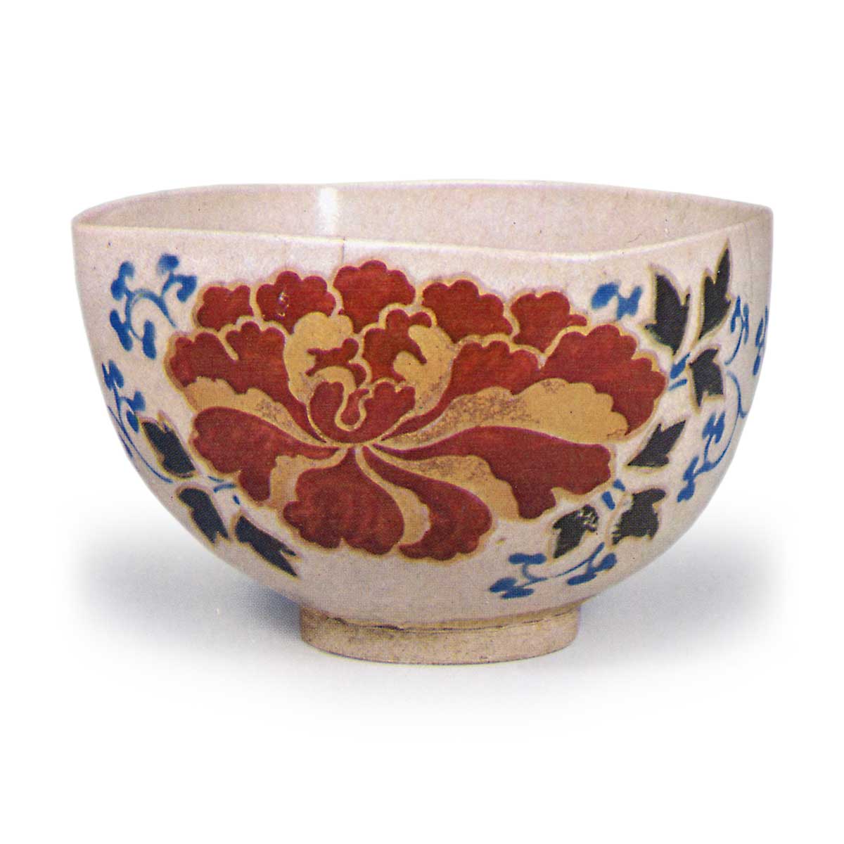 仁清色绘牡丹唐草纹四方茶碗 仁清仁清色绘牡丹唐草纹四方茶碗 X Facebook Hatena Bookmark LINE Pinterest 复制 2025.10.19 仁清色绘牡丹唐草纹四方茶碗 高8.1厘米 口径12.1×12.1厘米 底座直径5.2厘米器形与前图完全相同,但白釉呈现卯斑状烧成效果。器身一侧以金红两色粗犷描绘牡丹花朵,配以枝叶,花枝向两侧延伸成唐草纹样。此为仁清彩绘茶碗中初见之作,如此粗粝的牡丹绘制手法在茶碗中实属罕见。然而牡丹纹样在仁清陶器中实属常见。高台采用单薄削制工艺,内壁捺有仁清宗和的印章。内盒盖面题有“牡丹绘茶碗”字样,笔迹颇具宗和风格。